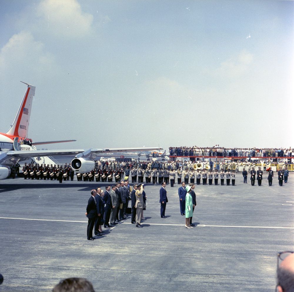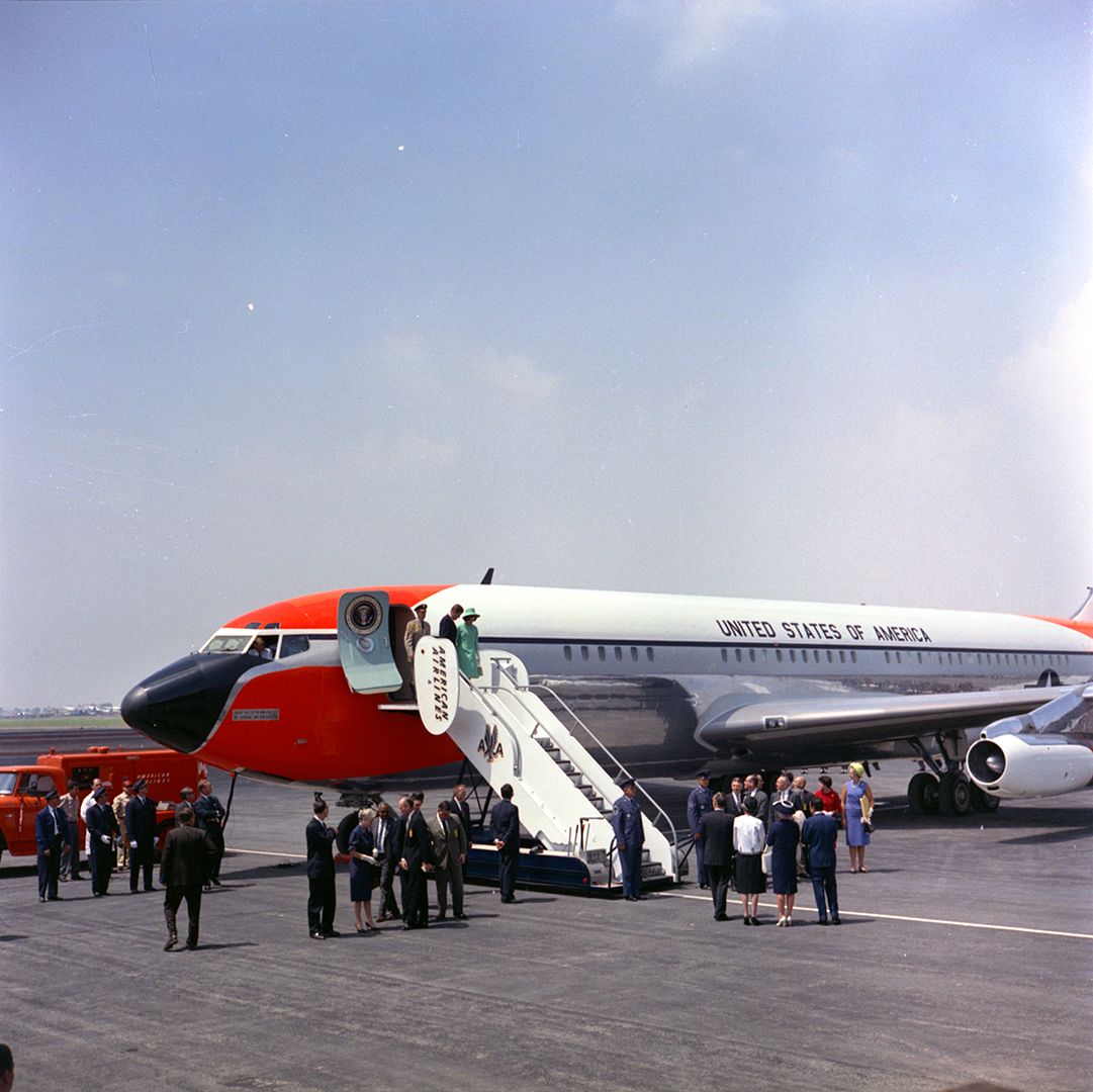 Taken 29 June 1962 ,President John F. Kennedy and First Lady Jacqueline Kennedy attend an arrival ceremony in their honor in Mexico City.Having flown on USA Air Force Boeing VC-137B (707-153B) 58-6972.