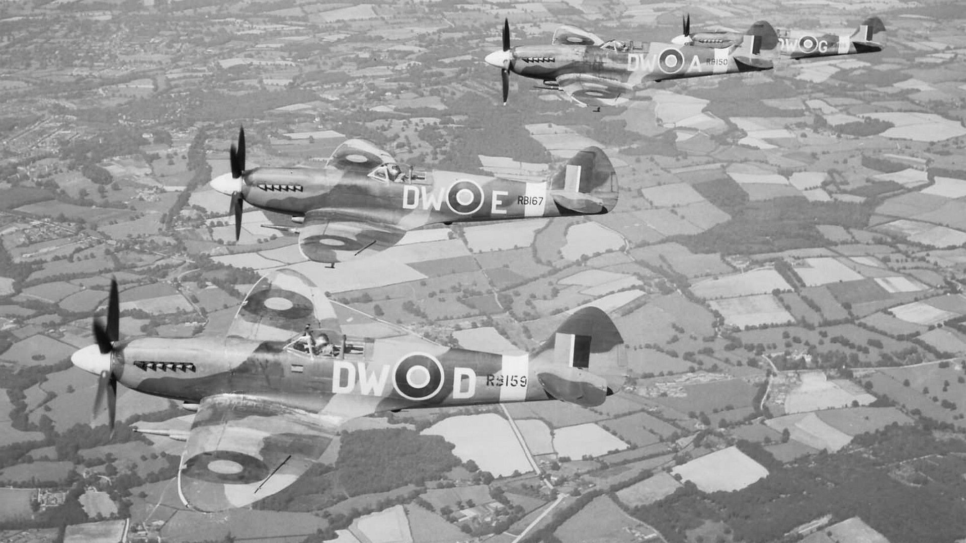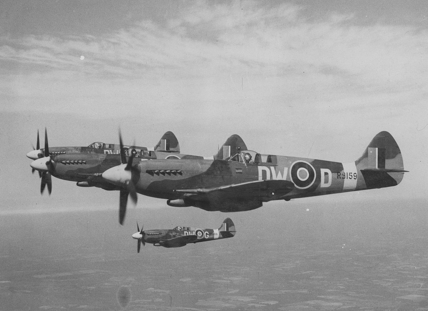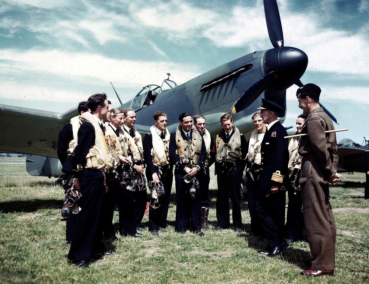 Commander of the Naval Air Service of the Royal Navy, Vice-Admiral Denis Boyd (1891-1965) talks to pilots next to a Fairey Firefly.
