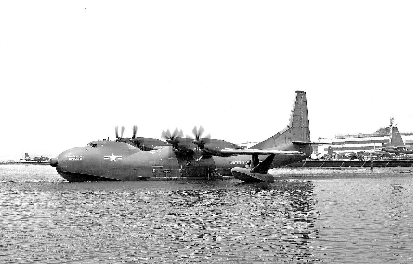 All aircraft were delivered to USN Air Transport Squadron Two (VR-2) based at NAS Alameda, California starting 31 March 1956 through 28 November 1956. The Tradewind was replacing the unit’s Martin Mars flying boat, the only seaplane larger than the Tradewind. The unit was tasked with flying between San Diego, California and Oahu, Hawaii. The first Tradewind to be delivered was the final built, a R3Y-2 model, and was named the “South Pacific.”