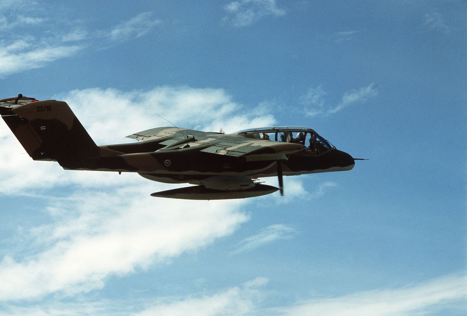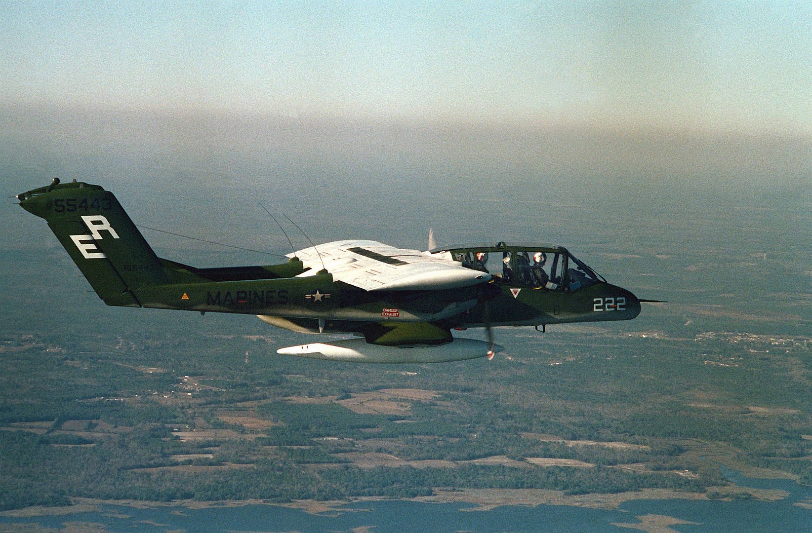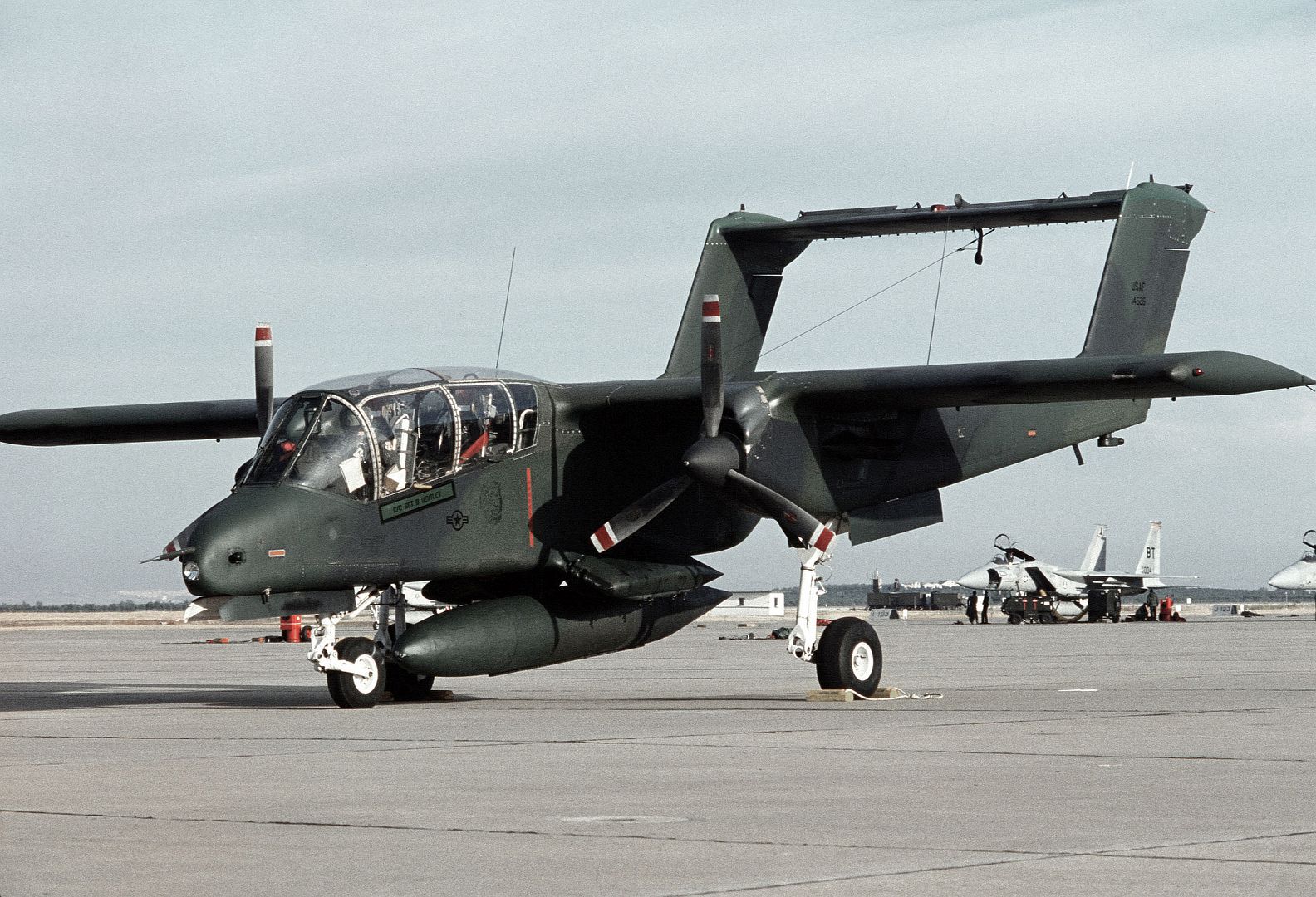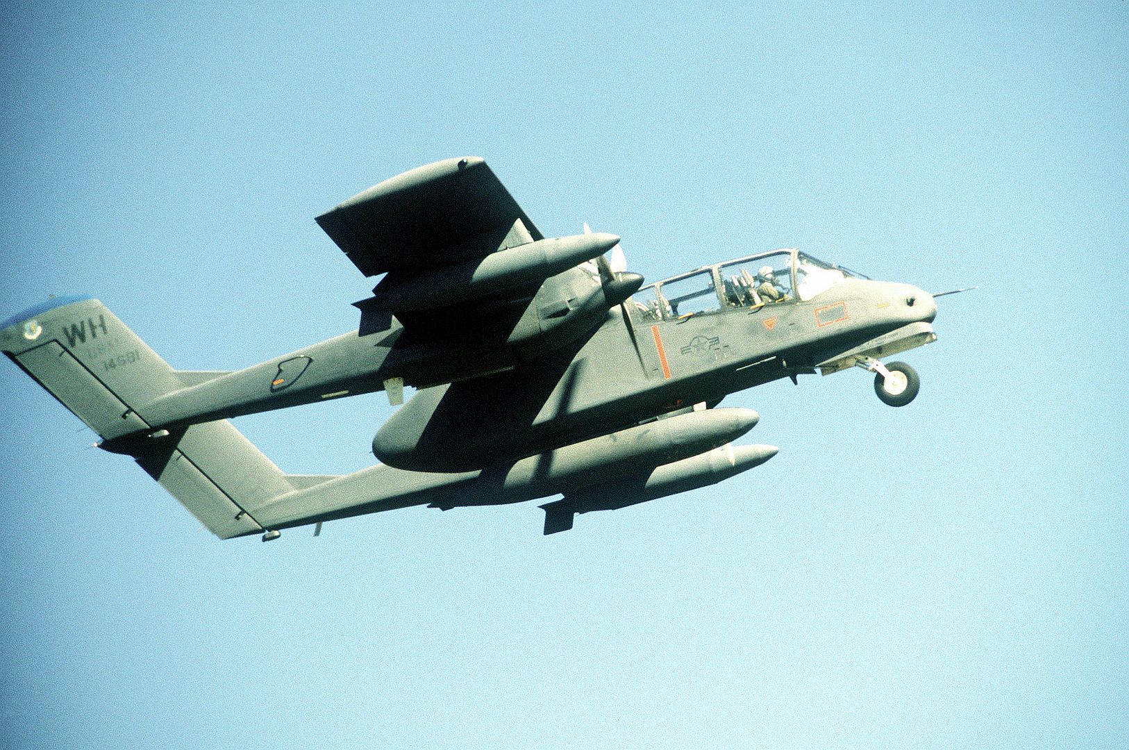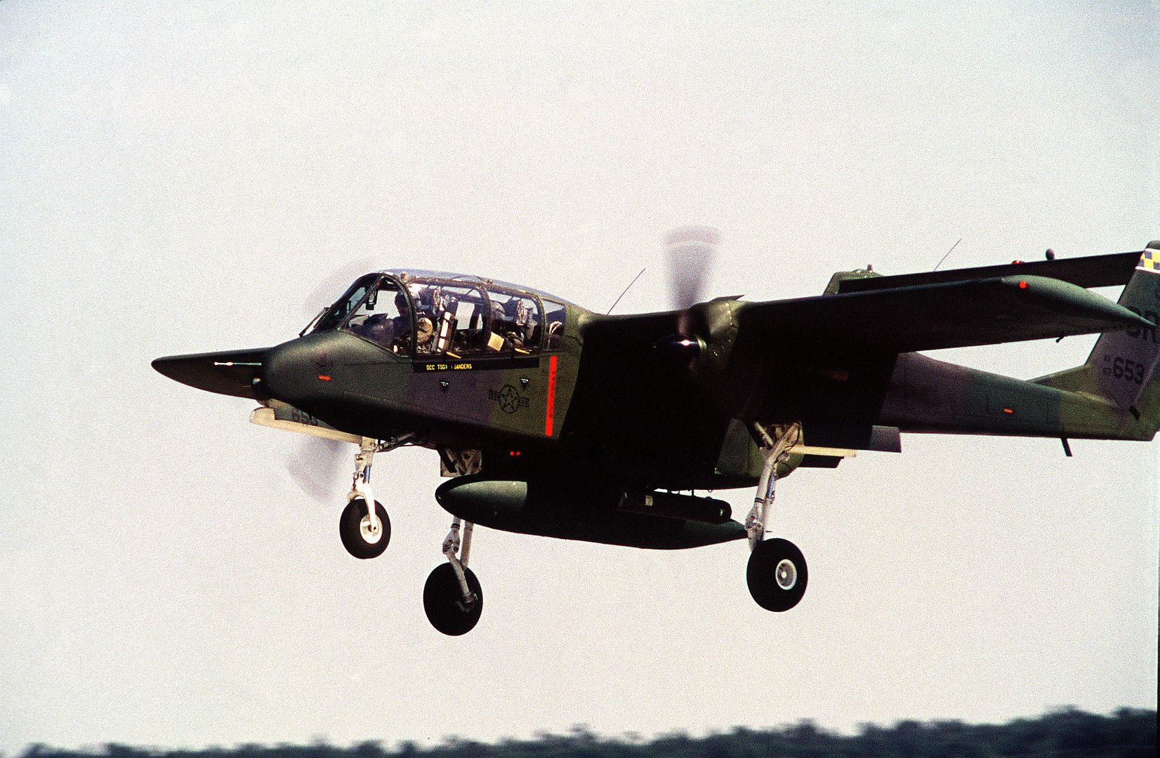 • The North American Rockwell OV-10 Bronco is an American twin-turboprop light attack and observation aircraft. It was developed in the 1960s as a special aircraft for counter-insurgency (COIN) combat, and one of its primary missions was as a forward air control (FAC) aircraft. It can carry up to 3,200 lb (1,450 kg) of external munitions and internal loads such as paratroopers or stretchers, and can loiter for three or more hours.