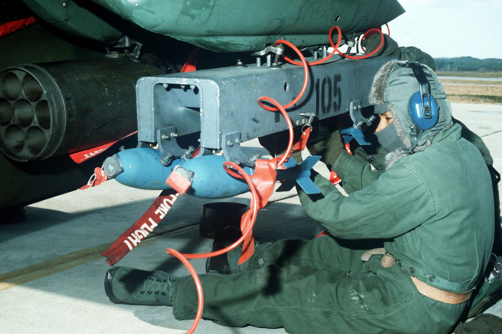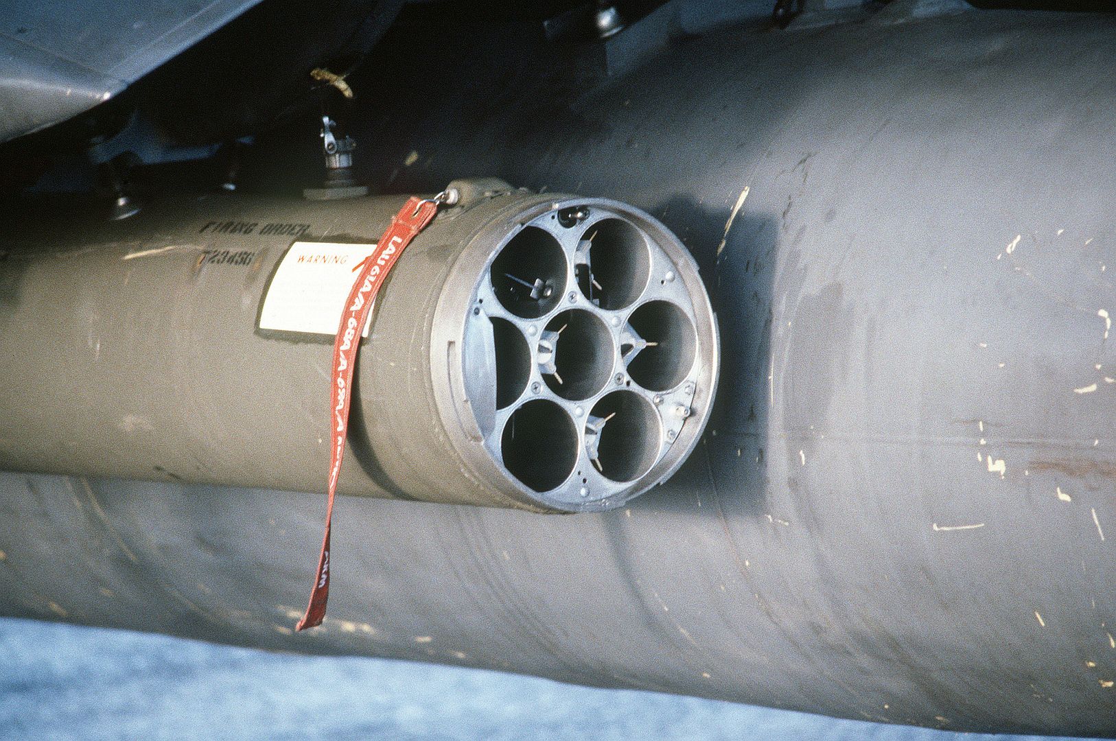 Racked armament in the Vietnam War was usually seven-shot 2.75 in (70 mm) rocket pods with white phosphorus marker rounds or high-explosive rockets, or 5 in (127 mm) four-shot Zuni rocket pods. Bombs, ADSIDS air-delivered/para-dropped unattended seismic sensors, Mk-6 battlefield illumination flares, and other stores were also carried.