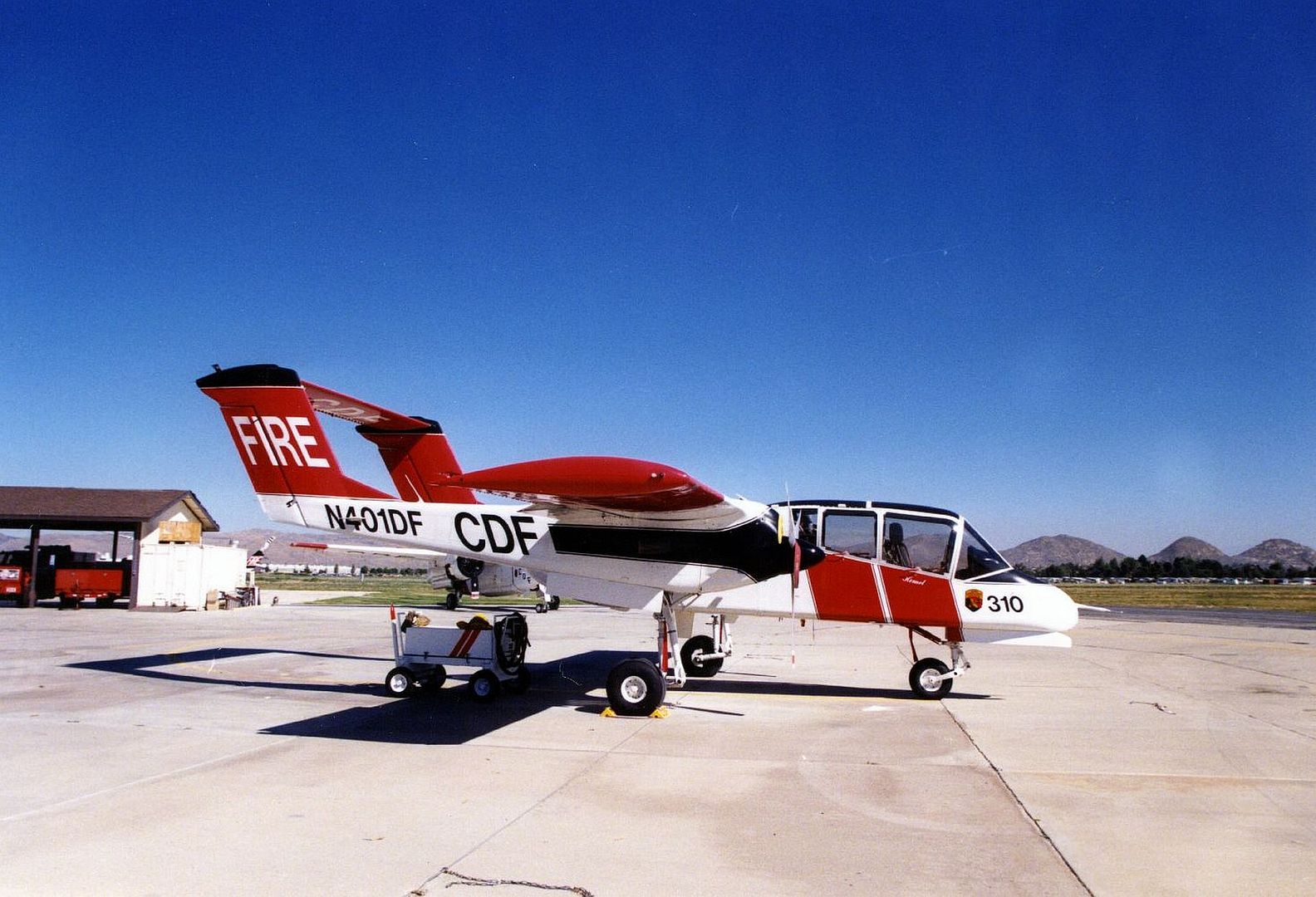 The California Department of Forestry and Fire Protection (CALFIRE) has acquired a number of OV-10As, including the six surviving aircraft from the BLM and 13 former U.S. Marine Corps aircraft in 1993 to replace their existing Cessna O-2 Skymasters as air-attack aircraft.The CAL FIRE Broncos fly with a crew of two, a contract pilot and the CAL FIRE ATGS or Air Tactical Group Supervisor, whose job it is to coordinate all aerial assets on a fire with the Incident Commander on the ground. Thus, besides serving as a tanker lead-in aircraft, the OV-10A is also the aerial platform from which the entire air operation is coordinated.