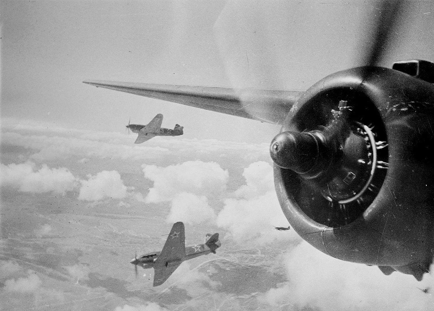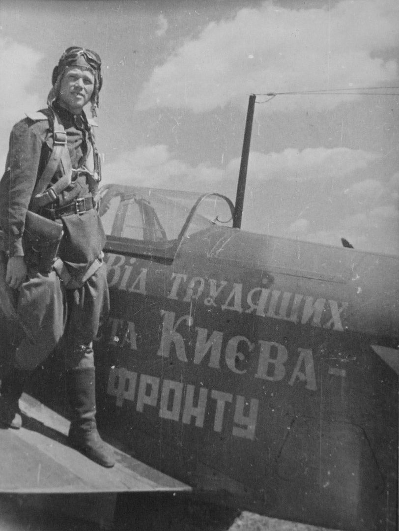 Below A Soviet pilot stands on the wing of a Yak-9 fighter jet bearing the Ukrainian inscription From the workers of the city of Kyiv to the front. This aircraft belongs to the 73rd Guards Fighter Aviation Regiment.
