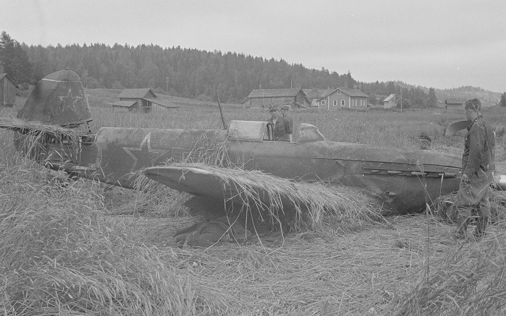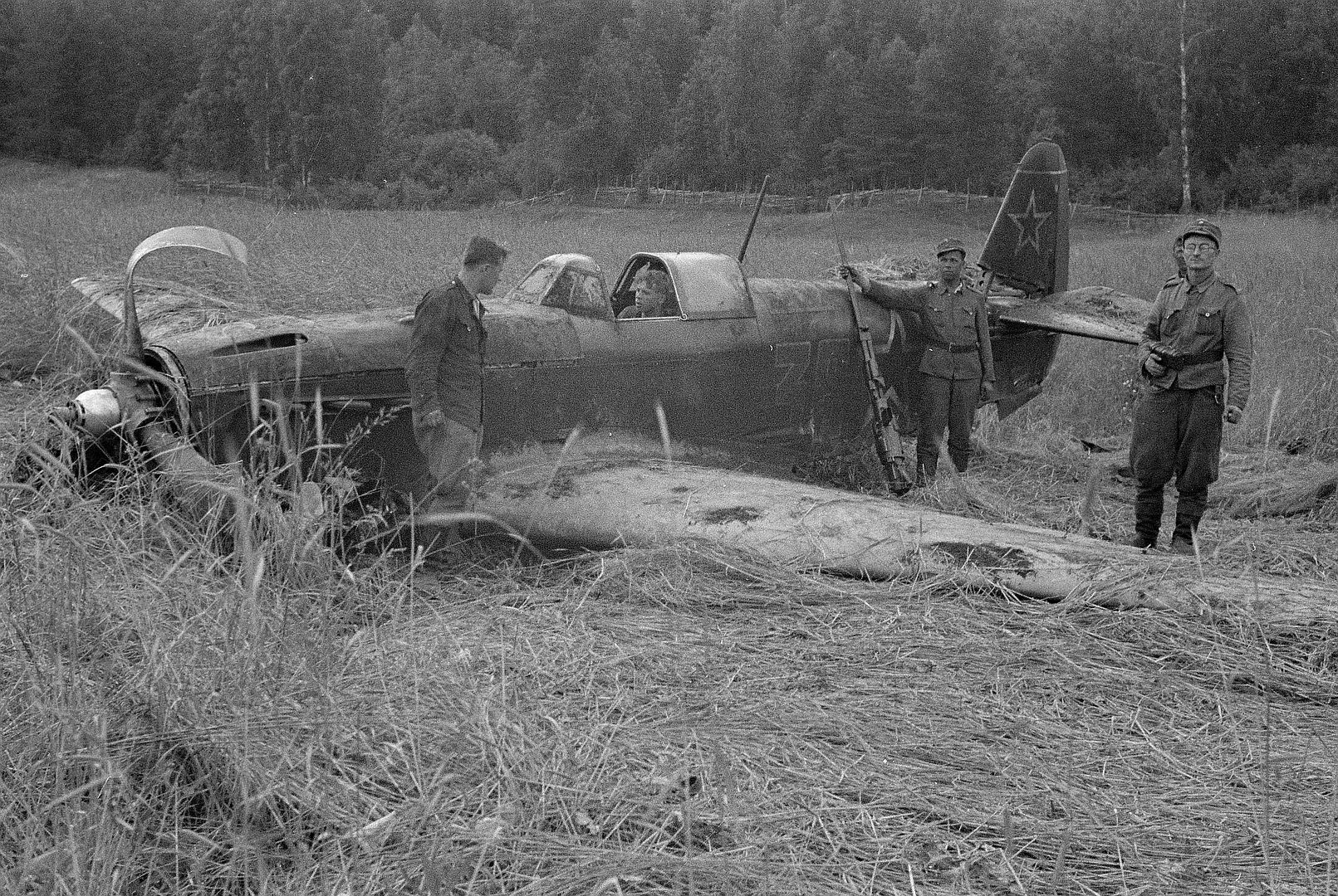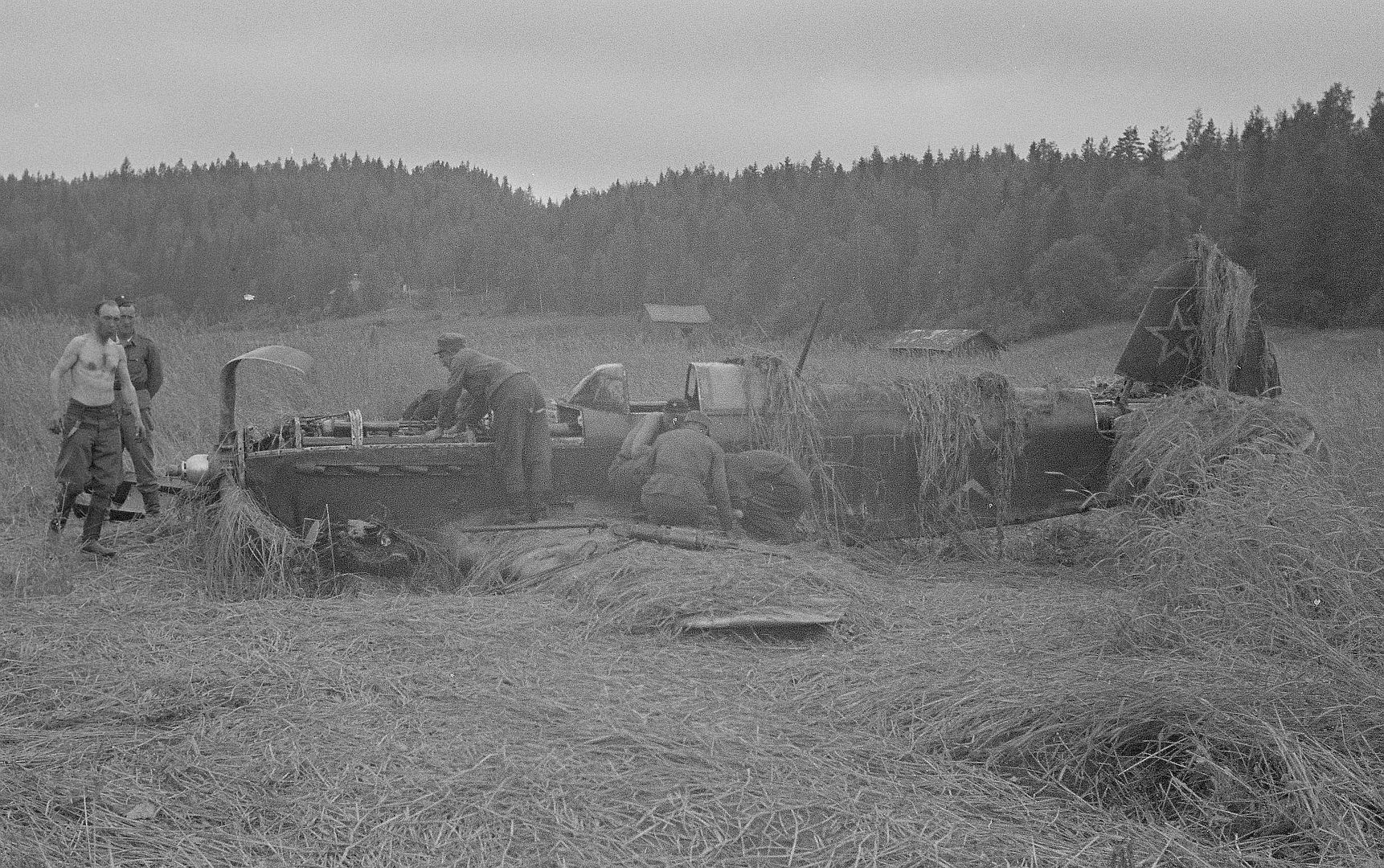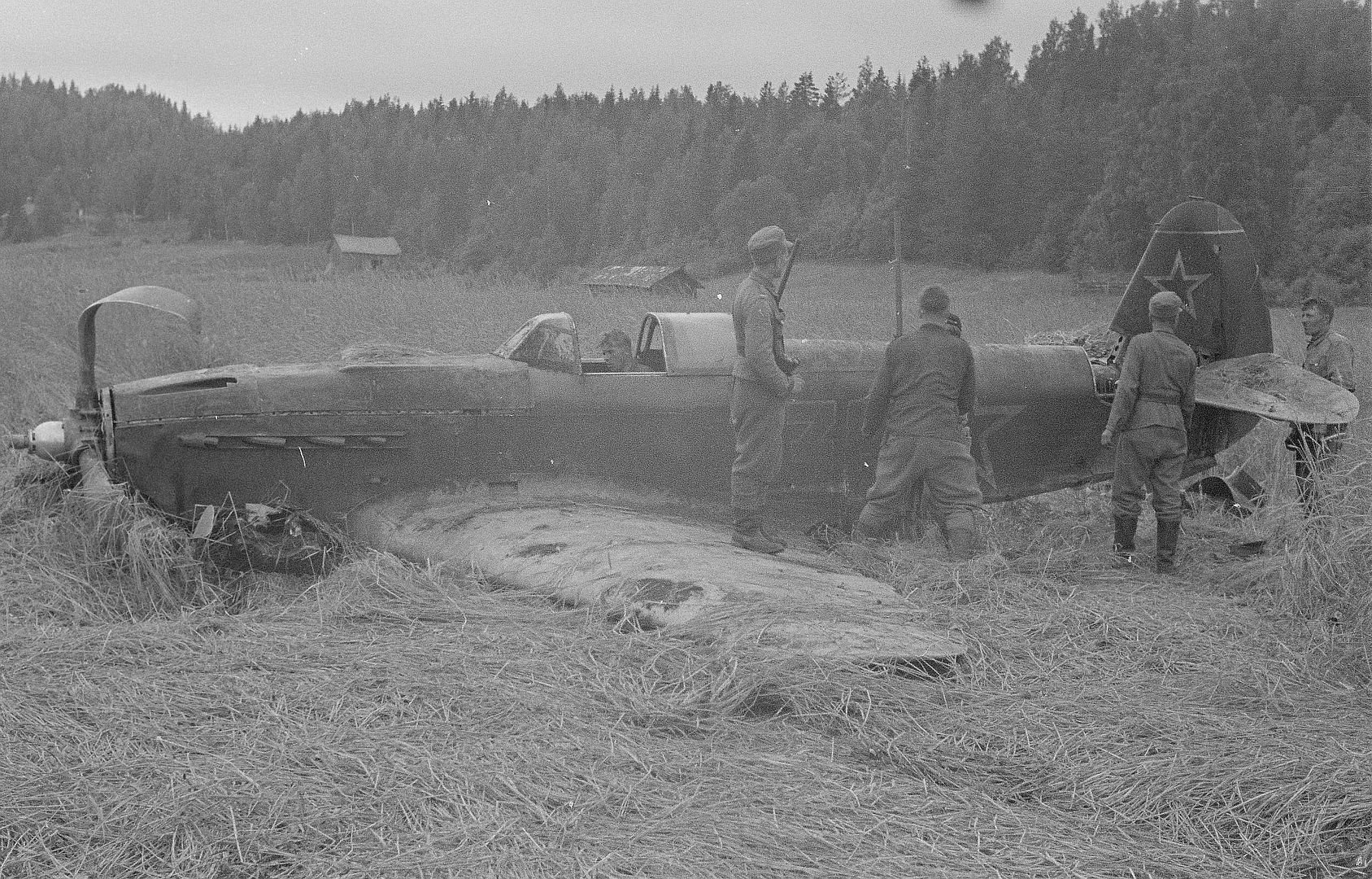 Below Finnish soldiers near a Soviet Yak-9 fighter that made an emergency landing in a rye field near Pitkäranta