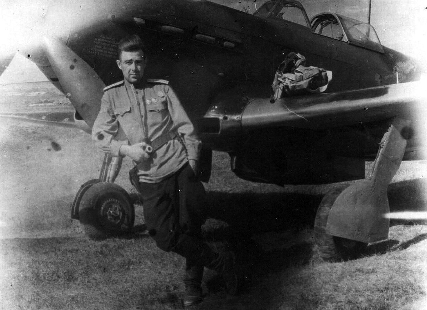 Below The commander of the 1st air squadron of the 65th Guards Fighter Aviation Regiment, Guard Captain Alexander Nikolaevich Kilaberidze in the cockpit of his Yak-9 fighter with the inscription For brother Shota
