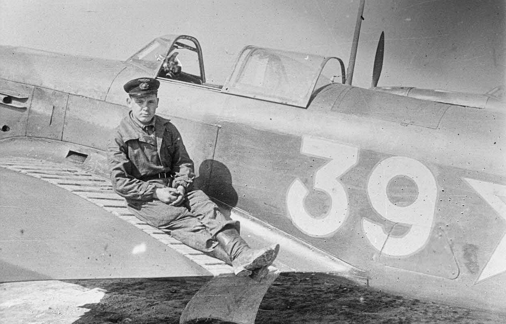 Below Lieutenant Léon Cuffaut of the Normandie Niémen fighter group, photographed in his Yakovlev Yak-9.