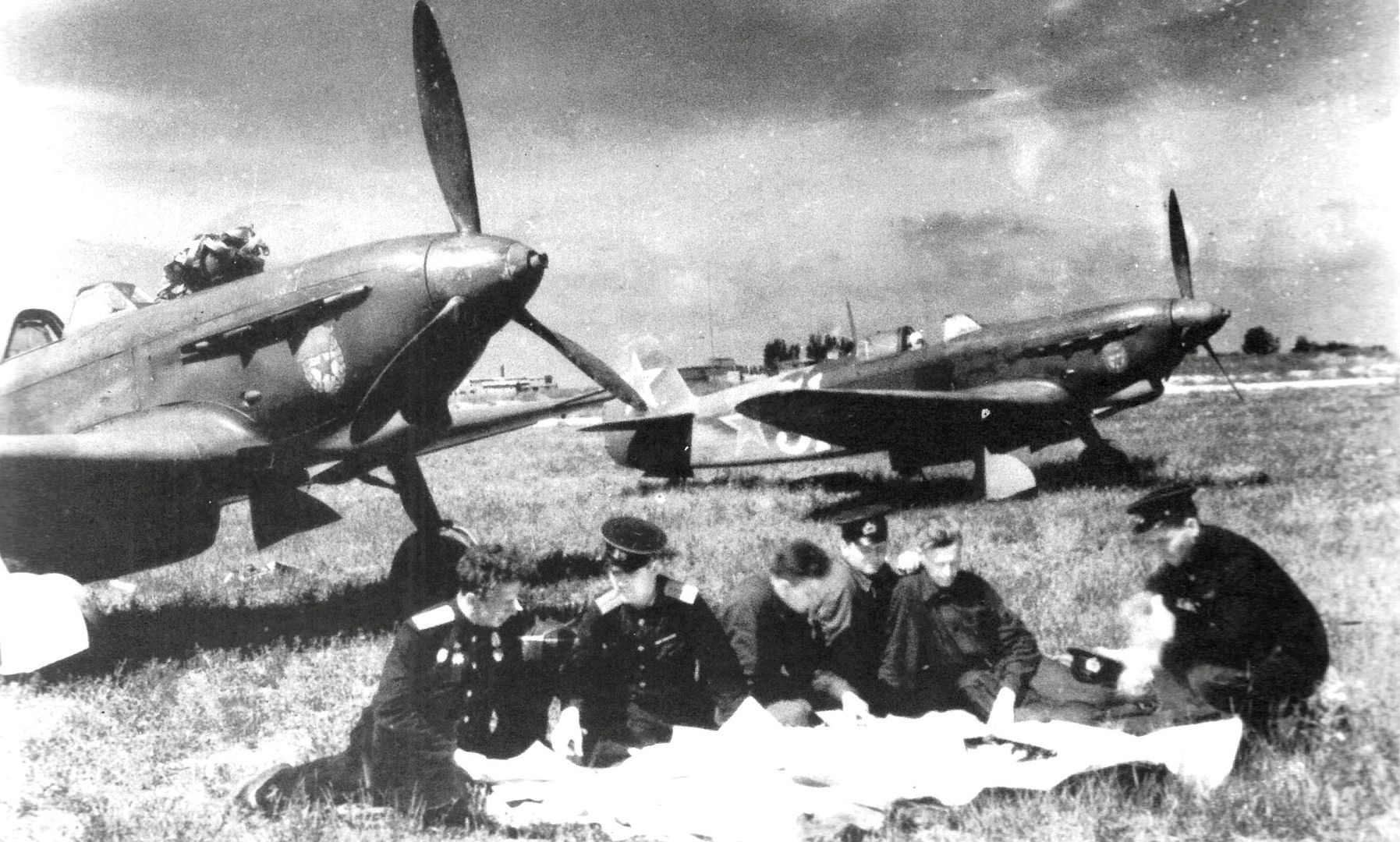 Below Technicians and pilots of the 513th Fighter Aviation Regiment play cards while on duty at an airfield in Czechoslovakia. Yak-9 fighters are in the background.