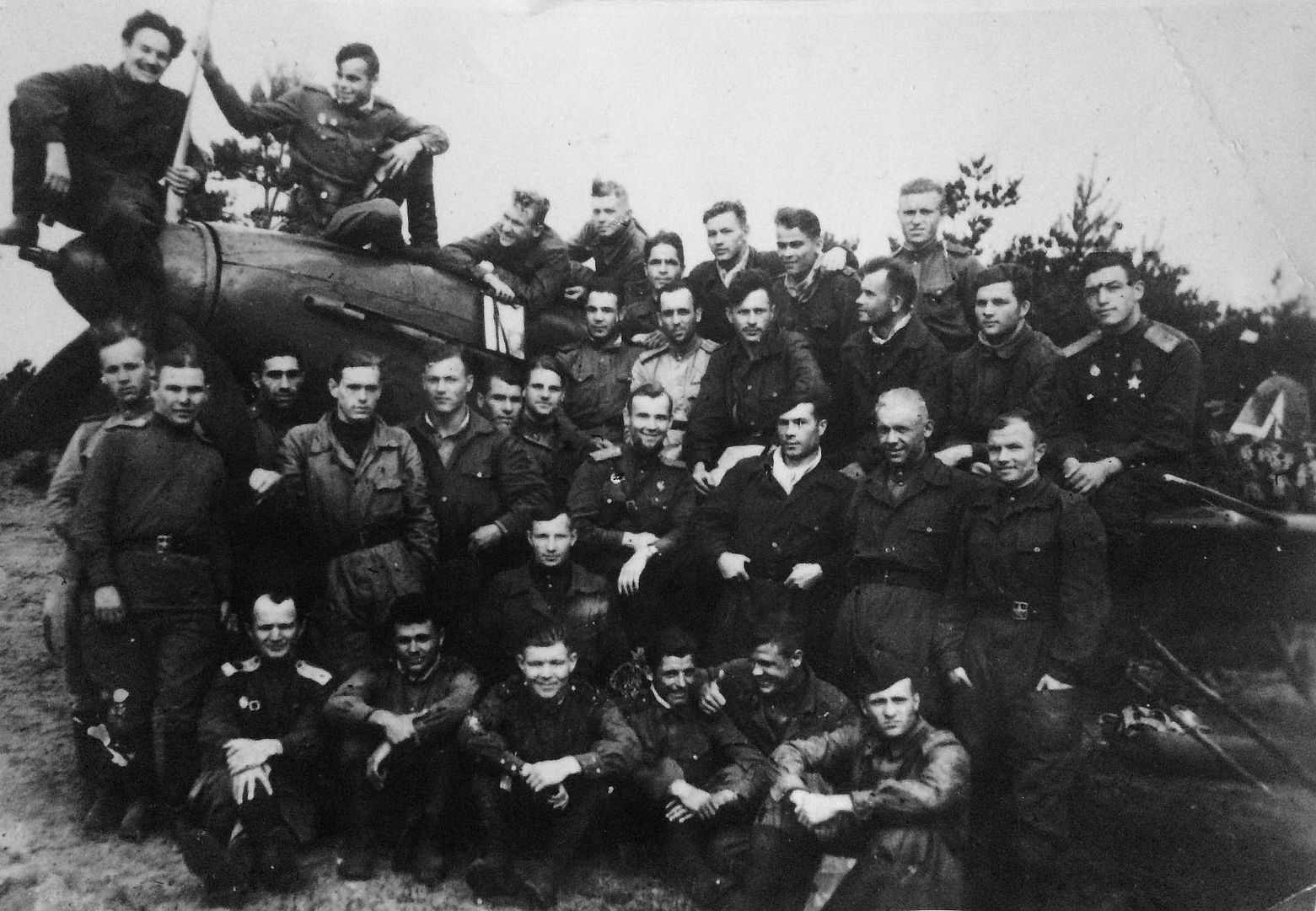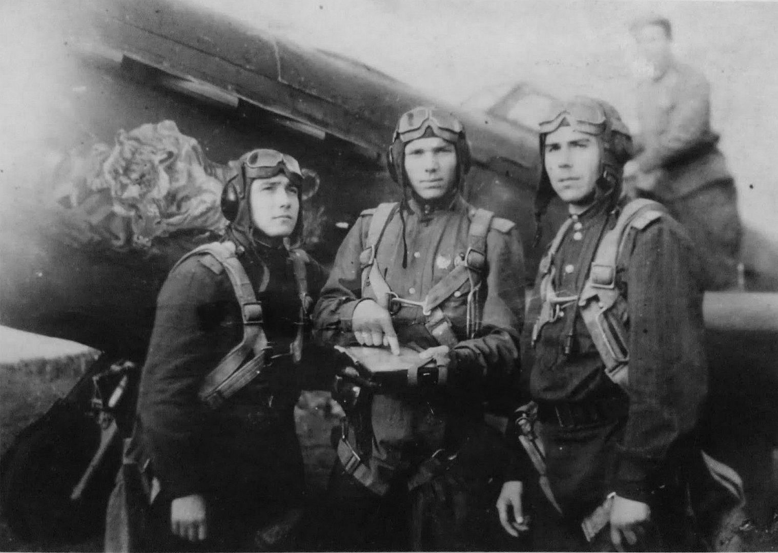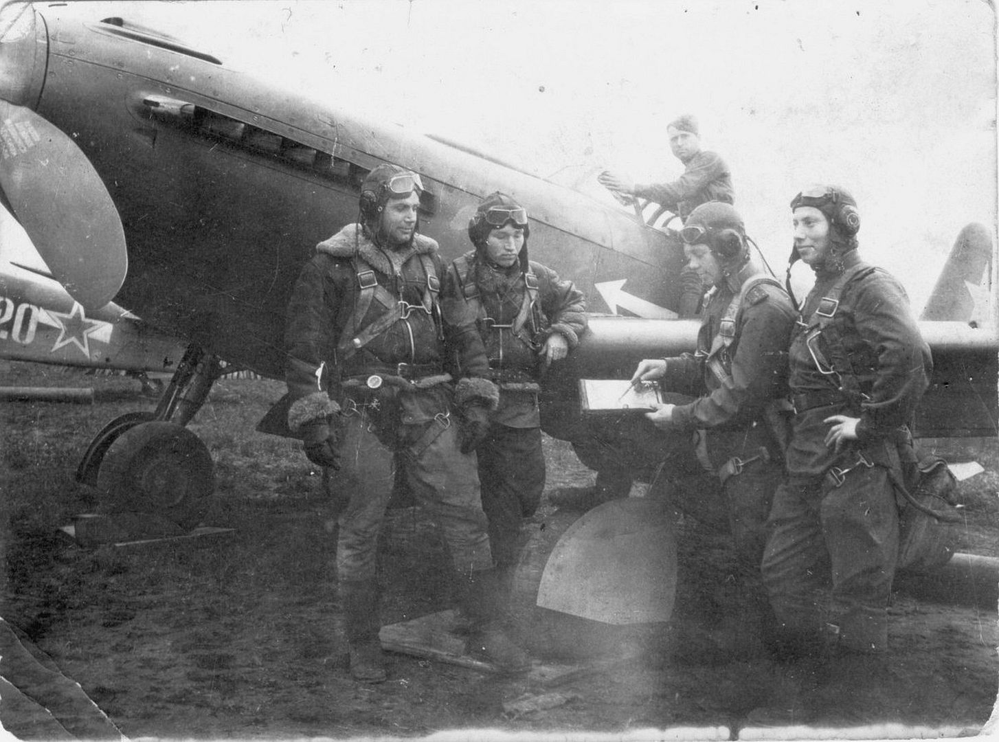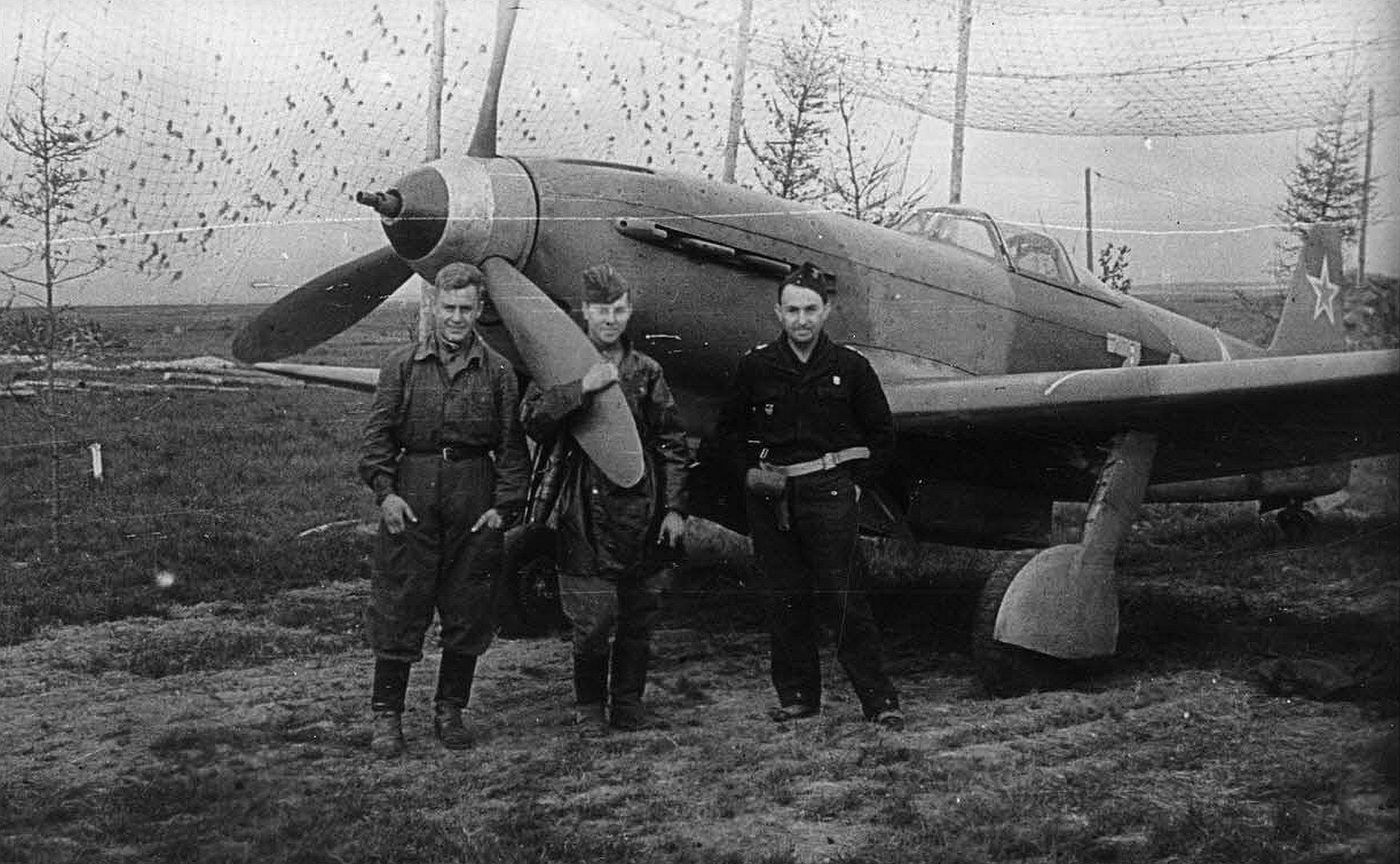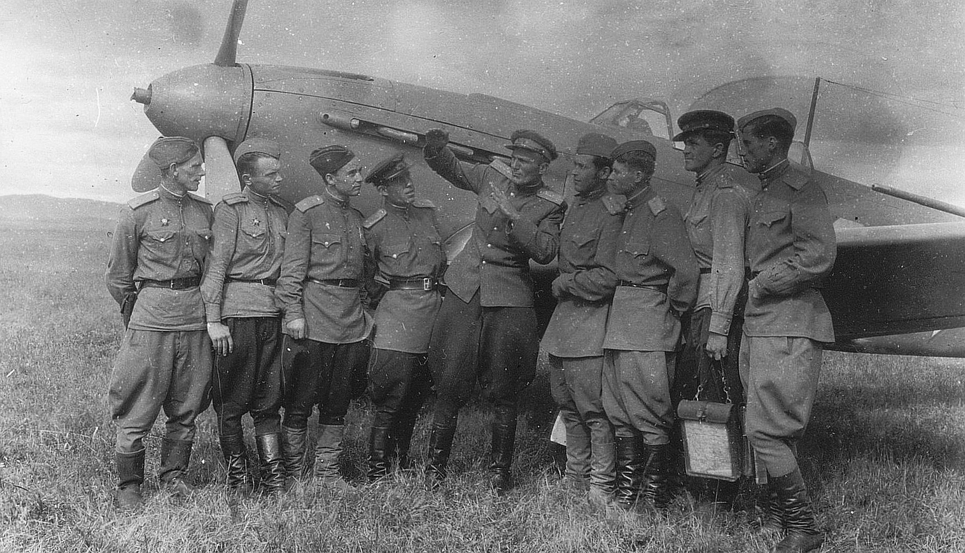 Below Pilots of the 402nd Fighter Aviation Regiment, 265th Fighter Aviation Division, 3rd Fighter Aviation Corps, after their flight during the Kaunas Offensive Operation. On the right is a Yak-9T fighter