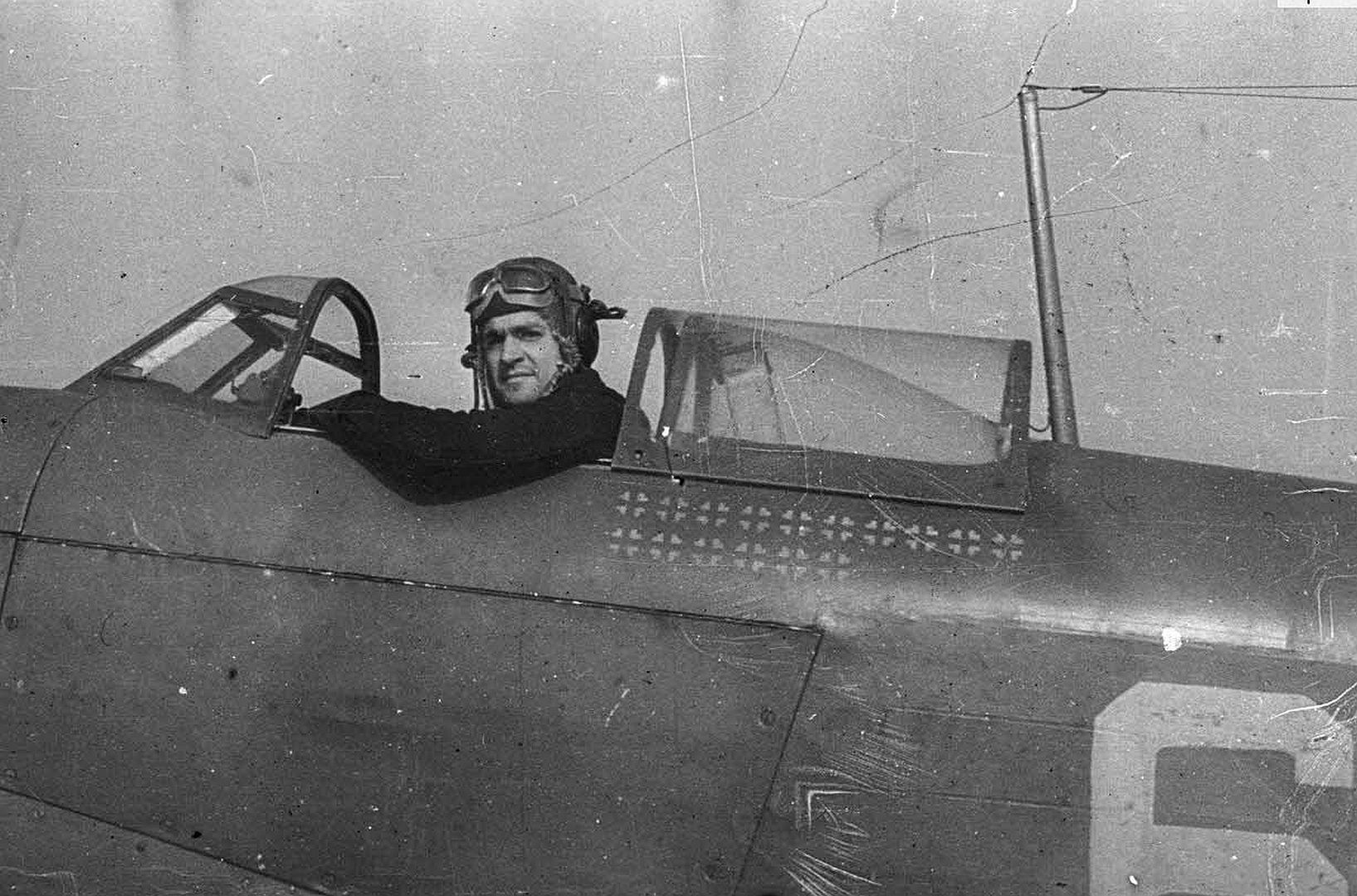 Below Lieutenant Marcel Albert, pilot of the Normandie-Niémen fighter regiment, at the controls of his Yakovlev Yak-9.