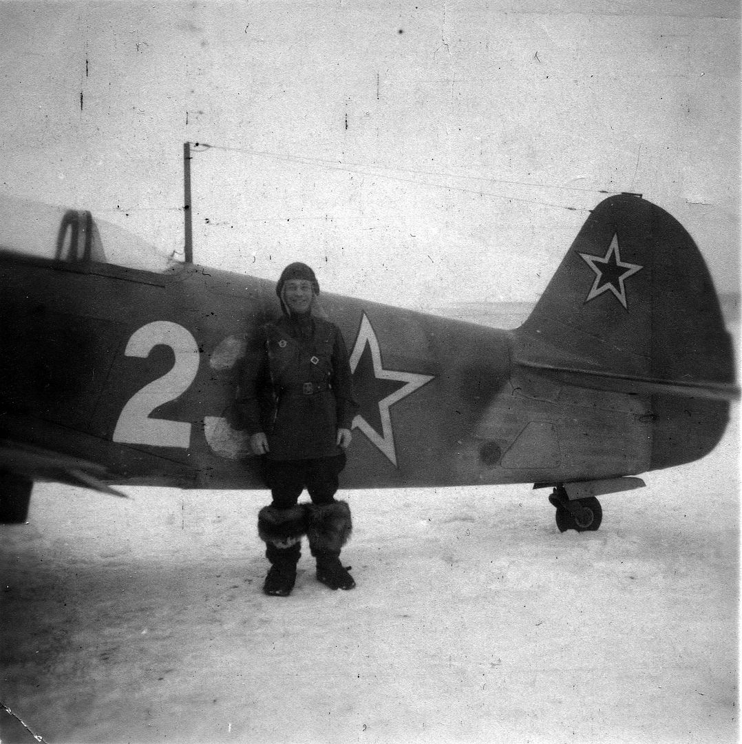 Below Squadron commander of the 4th Fighter Aviation Regiment Ilya Vasilyevich Shmelev with a Yak-9T fighter.