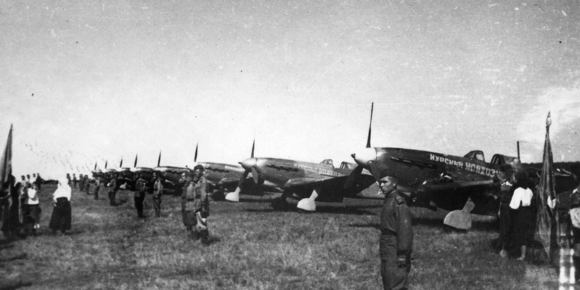 Below Transfer of Yak-9 Kursk Kolkhoznik fighters to the troops at the airfield in Ryshkovo.
