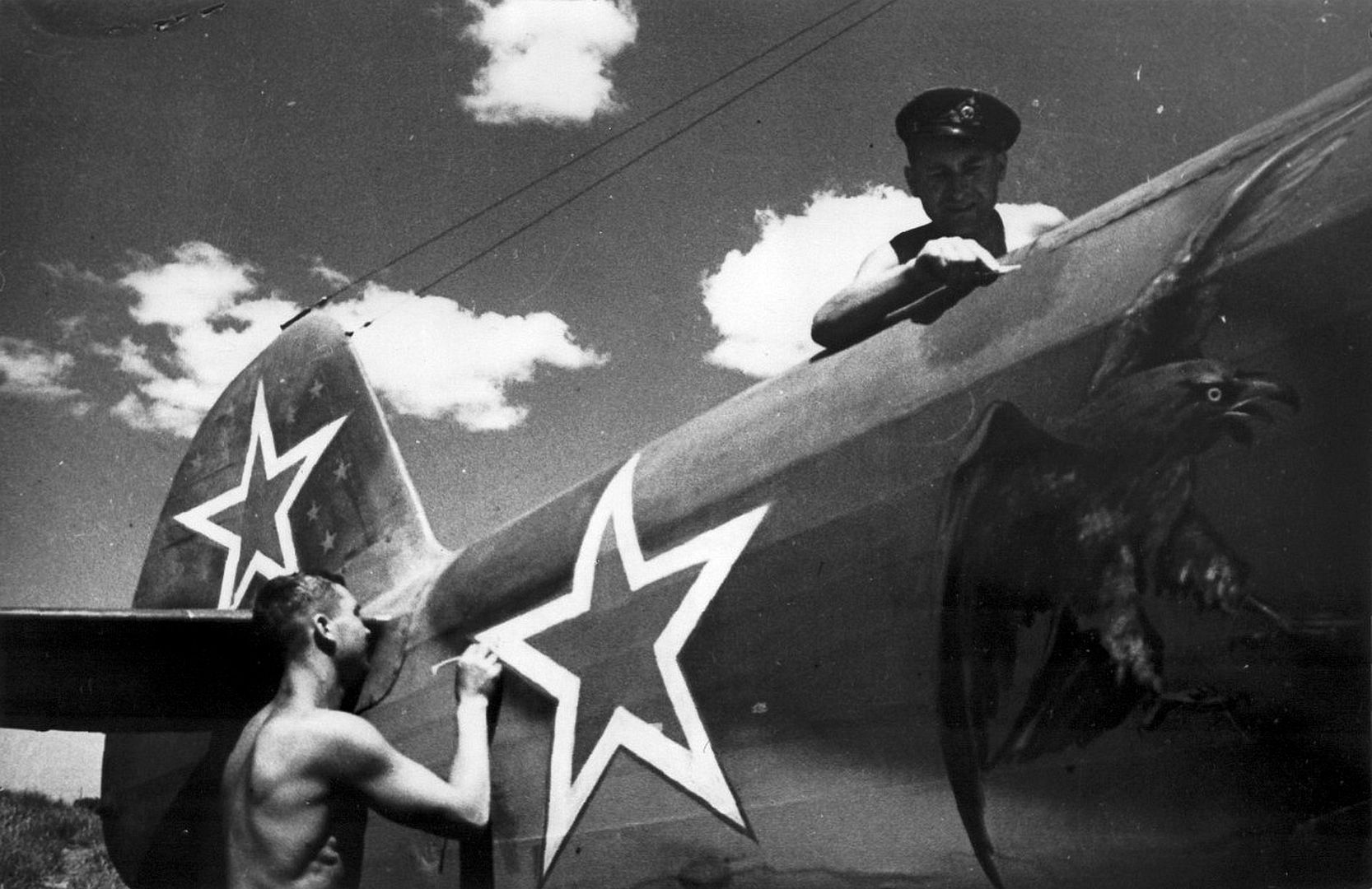 Below A Soviet pilot photographs his fellow pilot in a Yak-9 fighter. The photo, featuring the enacted scene from Sergei Nikolaevich Kamyshev's family archive, is titled War Correspondent.
