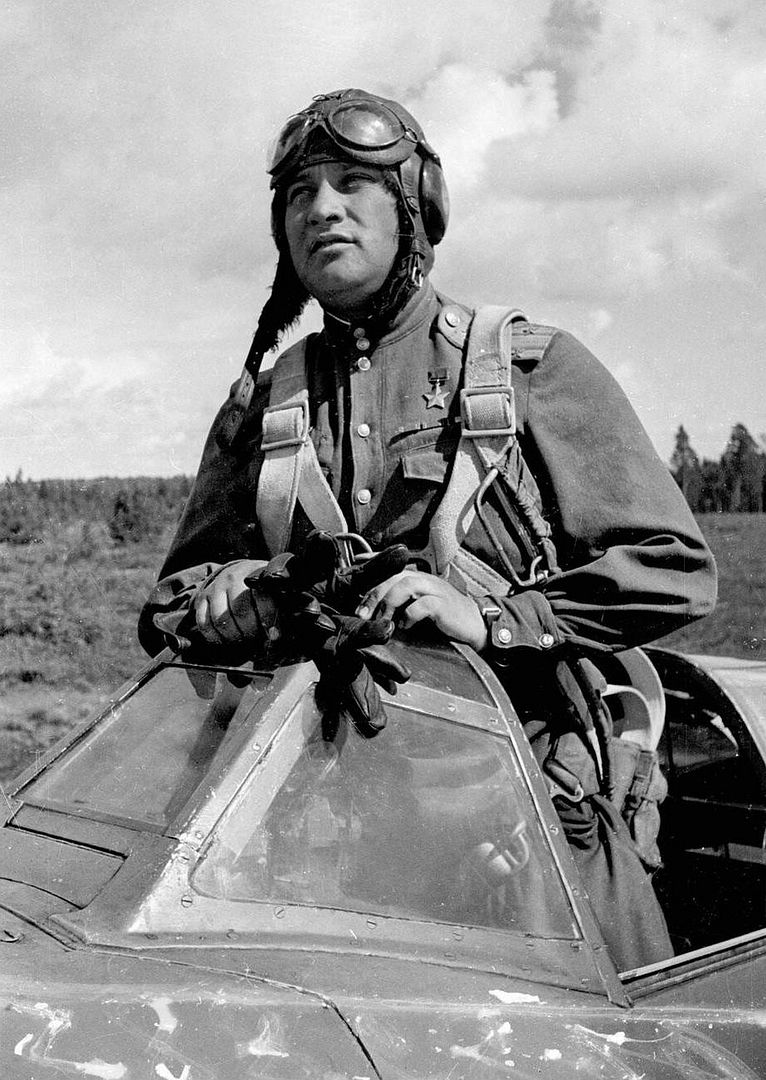 Below Squadron commander of the 5th Guards Red Banner Fighter Aviation Regiment, Hero of the Soviet Union, Guards Captain Vitaly Ivanovich Popkov with a Yak-9U fighter.