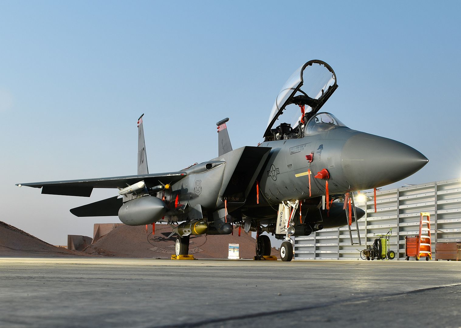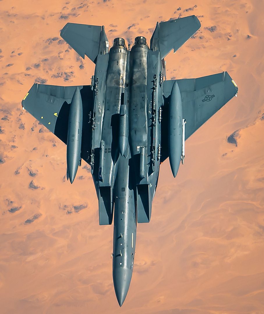 A U.S. Air Force F-15E Strike Eagle flies in the U.S. Central Command area of responsibility Jan. 27, 2021. The F-15E Strike Eagle is a dual-role fighter designed to perform air-to-air and air-to-ground missions, demonstrating U.S. Air Force Centrals' posture to defend and deter against potential aggression. (U.S. Air Force photo by Staff Sgt. Sean Carnes)