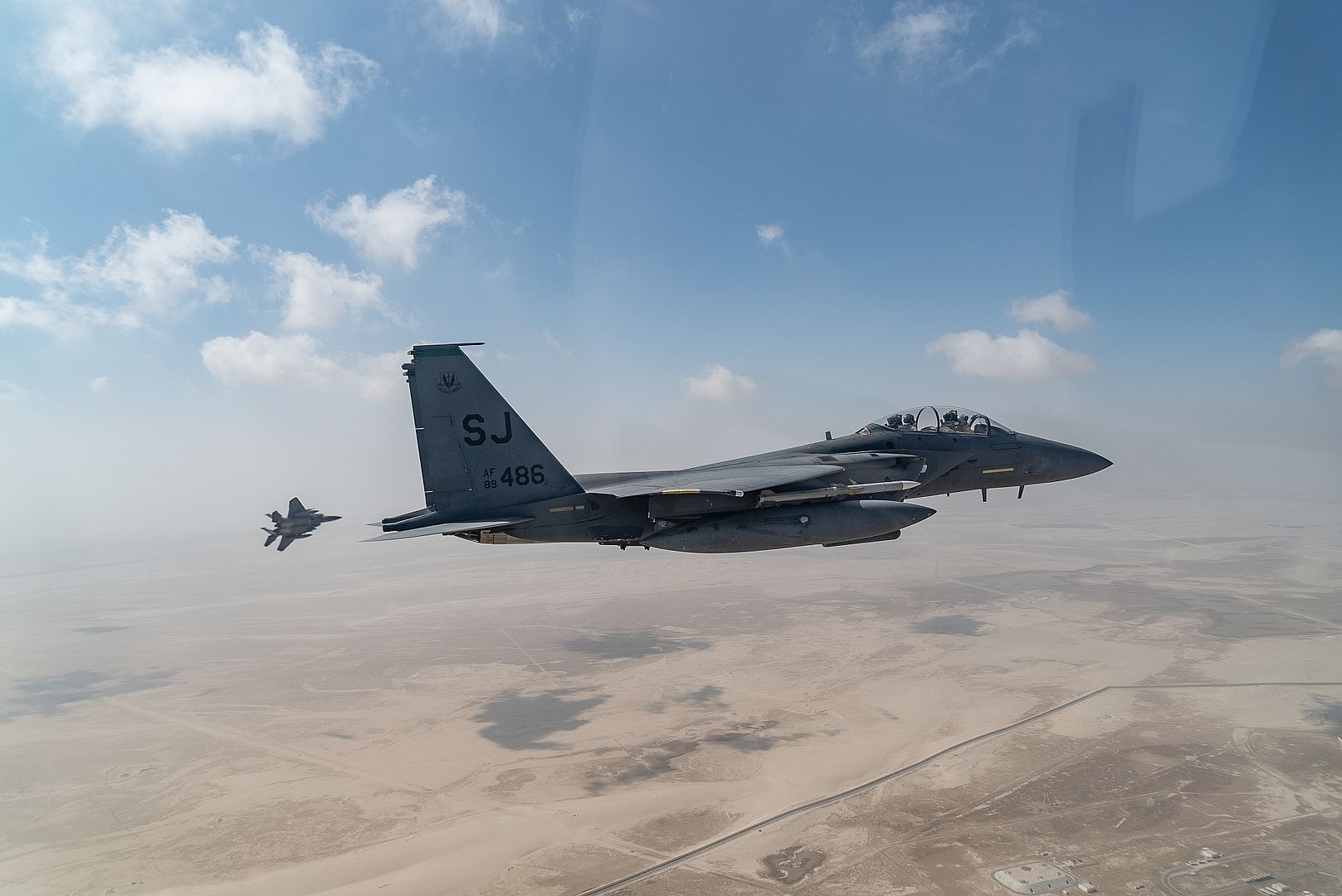 U.S. Air Force F-15E Strike Eagles fly over the U.S. Central Command area of responsibility Jan. 27, 2021. The B-52 Stratofortress is a long-range, heavy bomber that is capable of flying at high subsonic speeds at altitudes of up to 50,000 feet and can carry nuclear or precision guided conventional ordnance with global reach precision navigation capability. (U.S. Air Force photo by Senior Airman Roslyn Ward)