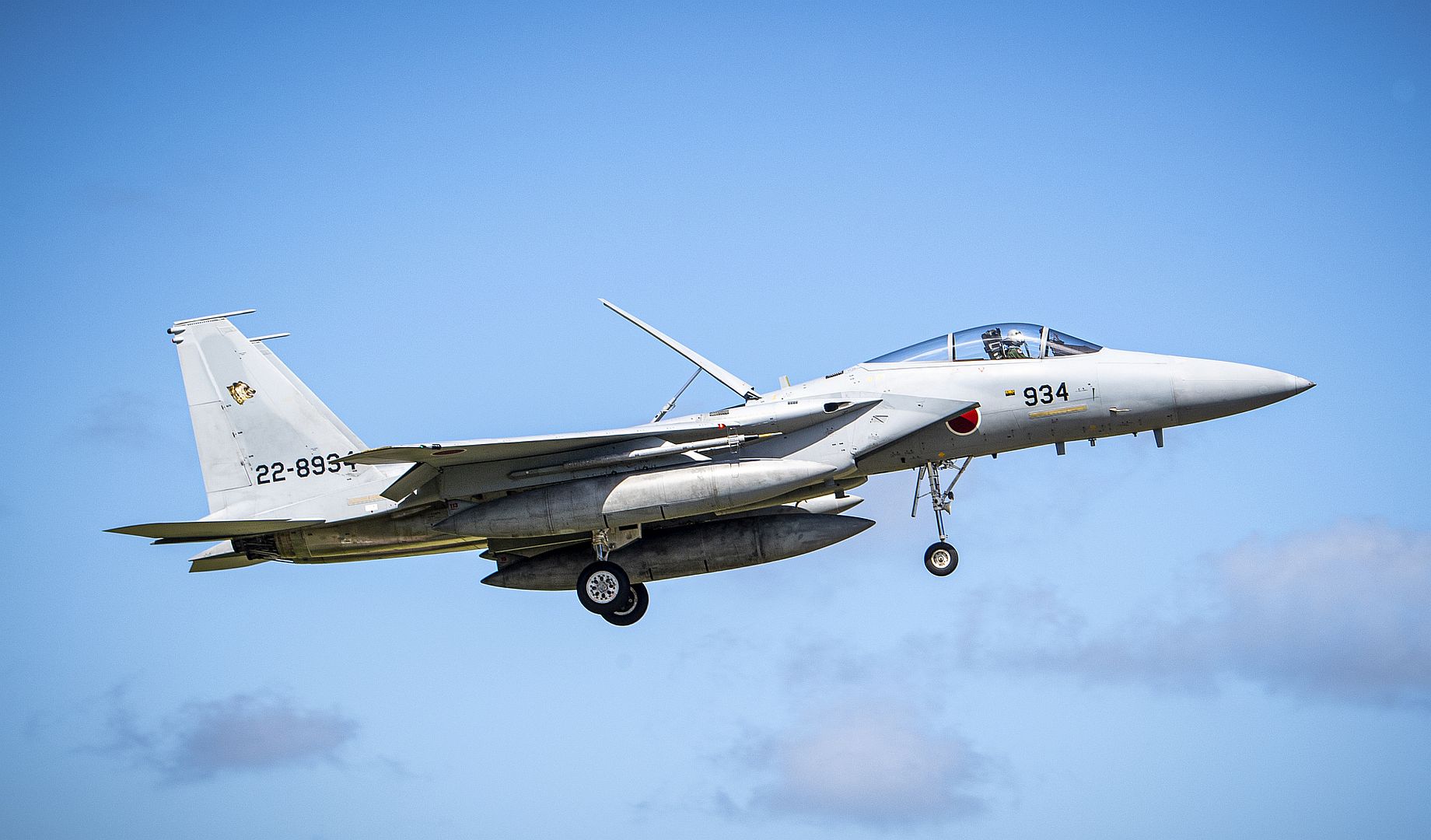 Japan Air Self-Defense Force, or Koku-Jieitai, F-15J Eagles prepare to land at Andersen Air Force Base, Guam, during exercise Cope North 21, Jan. 28, 2021. Cope North is an annual exercise that serves as a keystone event to promote stability and security throughout the Indo-Pacific. (U.S. Air Force photos by Senior Airman Duncan C. Bevan)