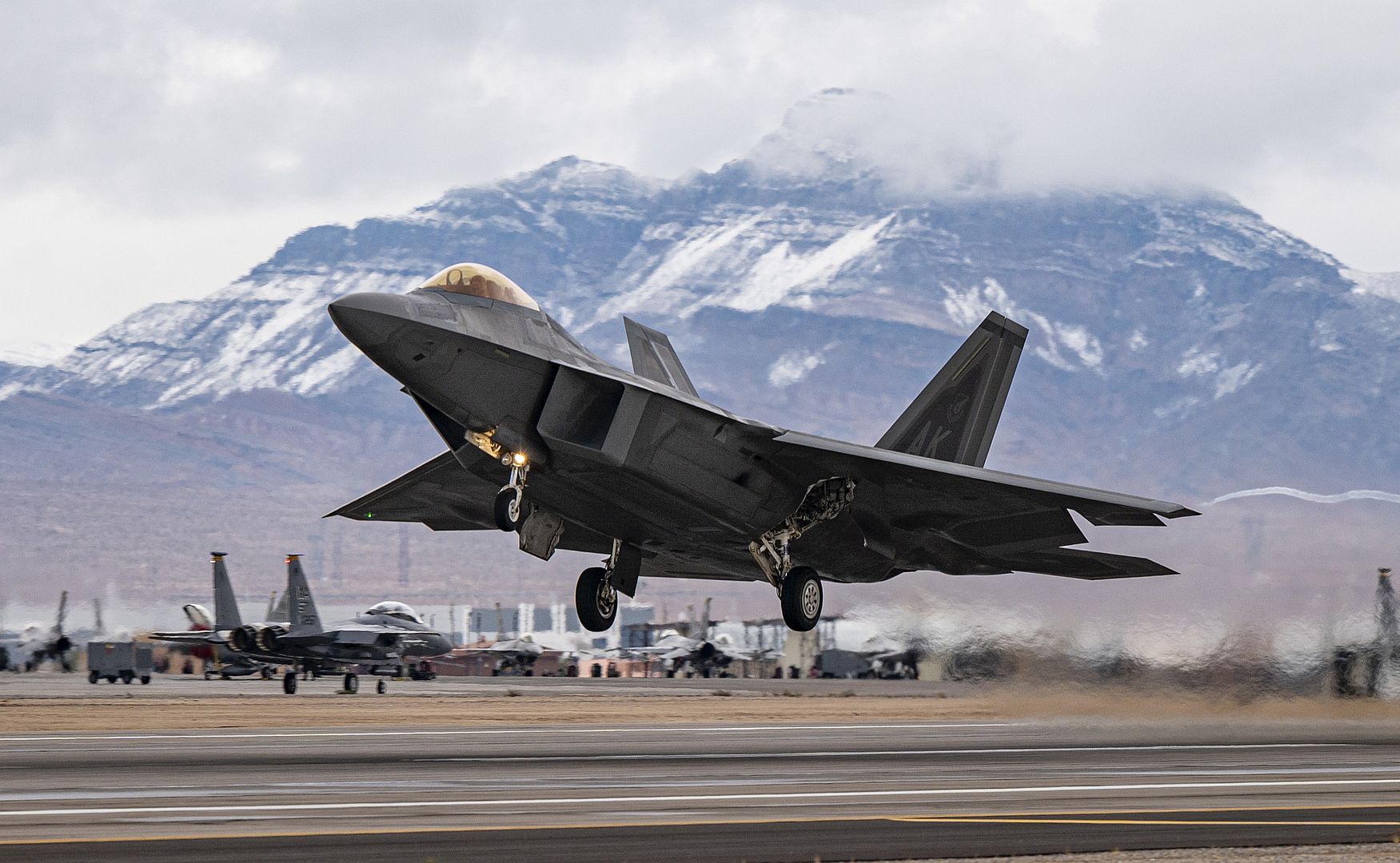 F-22 Raptor fighter jets, assigned to the 525th Fighter Squadron, Joint Base Elmendorf-Richardson, Alaska, take-off for a Red Flag 21-1 mission at Nellis Air Force Base, Nevada, Jan. 26, 2021. The F-22 Raptor is capable of both air-to-air missions and air-to ground missions. (U.S. Air Force photos by William R. Lewis)