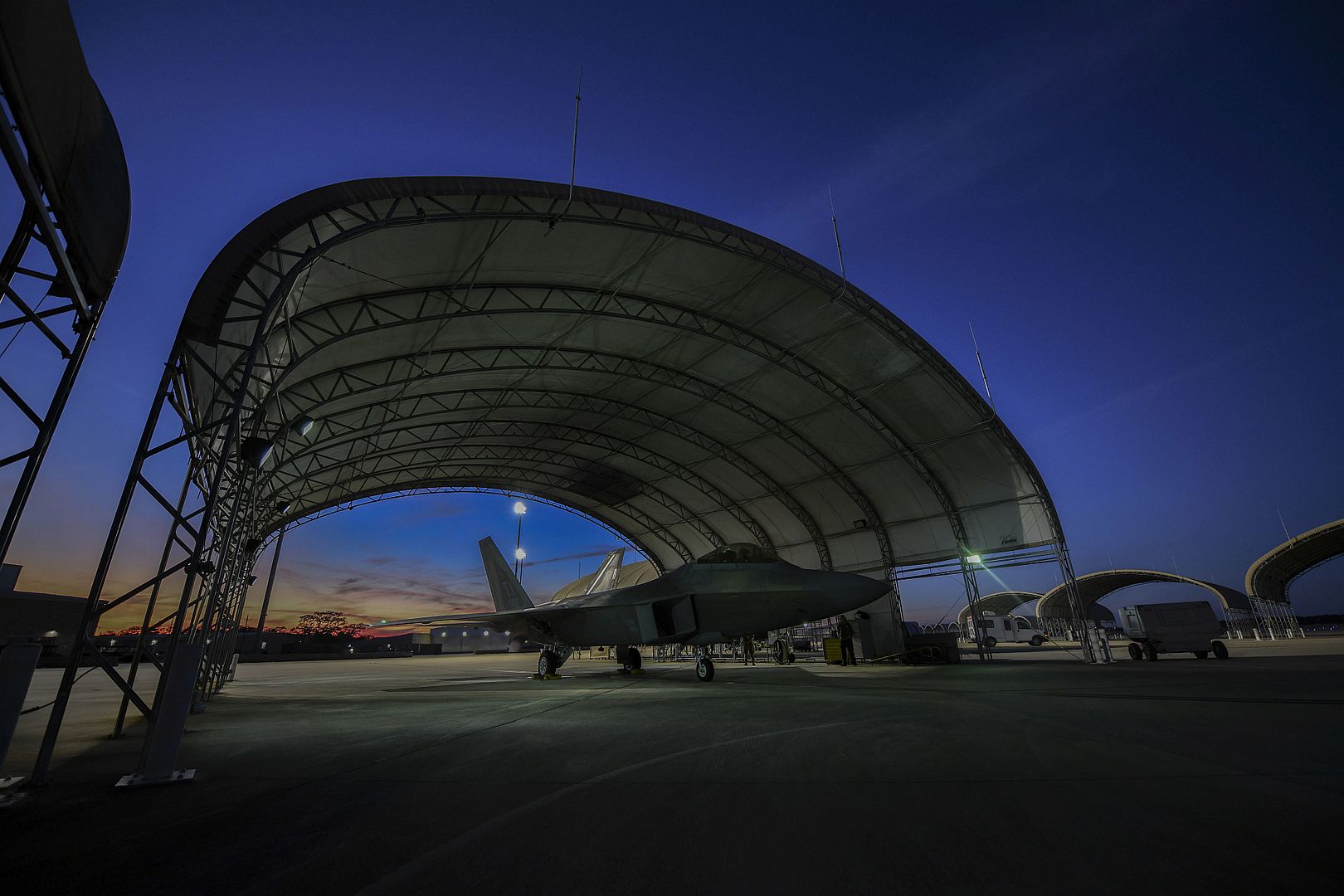 A U.S. Air Force F-22 Raptor with the 325th Fighter Wing undergoes pre-flight checks at Eglin Air Force Base, Florida, Jan. 28, 2021. As part of a routine night flying exercise, the jet was staged on the flight line in preparation for take-off. (U.S. Air Force photo by Airman 1st Class Tiffany Price)