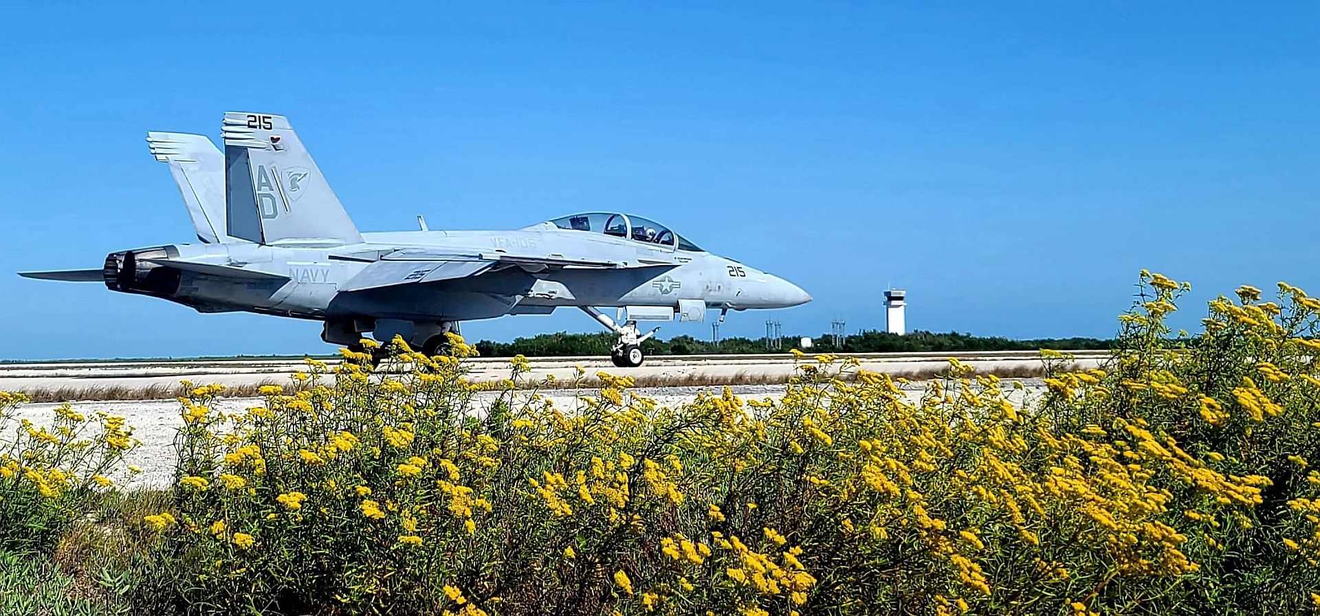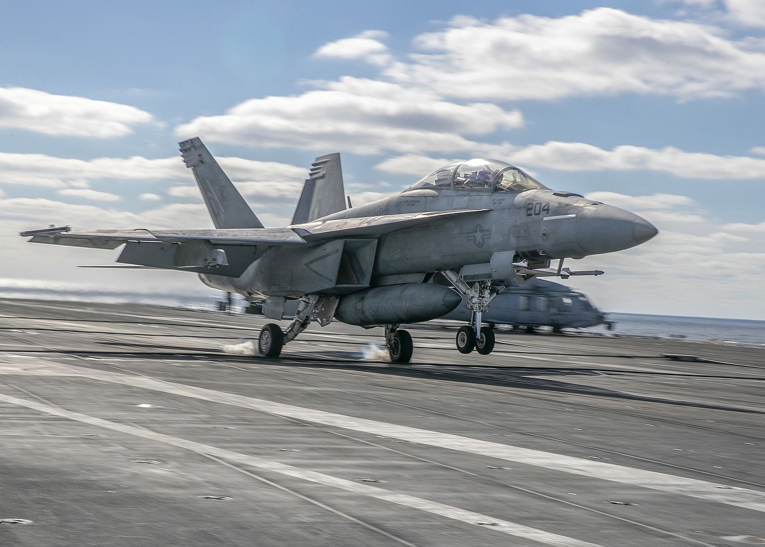 An F/A-18F Super Hornet attached to the “Gladiators” of Strike Fighter Squadron (VFA) 106 performs a touch and go on Gerald R. Ford's (CVN 78) flight deck Jan. 30, 2021. Ford is underway in the Atlantic Ocean conducting carrier qualifications. (U.S. Navy photo by Mass Communication Specialist 2nd Class Kallysta Castillo)