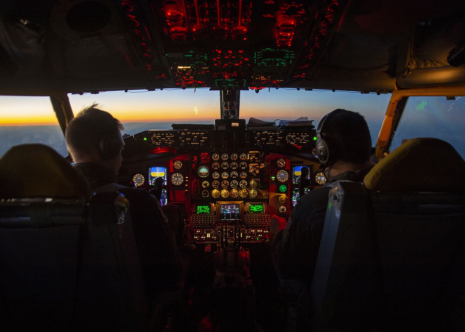 Pilots assigned to MacDill Air Force Base, Fla. look at the horizon from a KC-135 Stratotanker prior to refueling a B-2 Spirit, Feb 7, 2021. A B-2 Spirit performed alongside a B-1B Lancer and a B-52 Stratofortress for the Super Bowl LV flyover on Feb. 7, 2021.