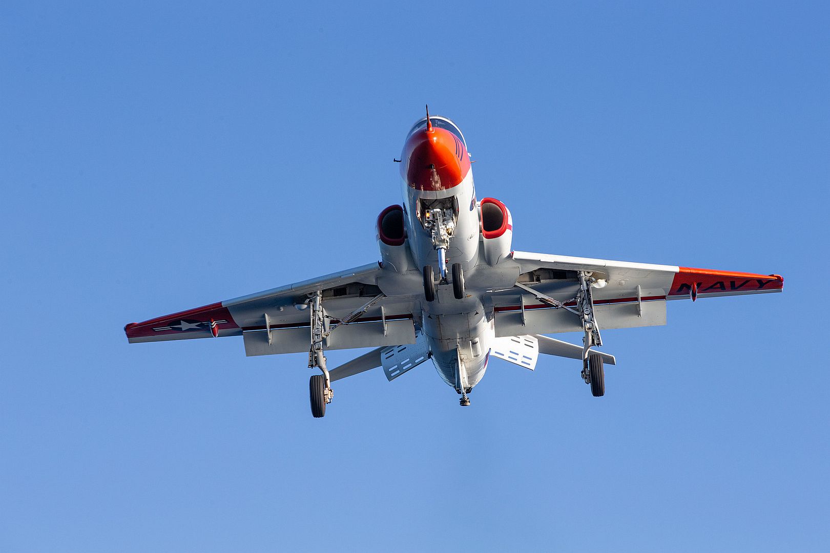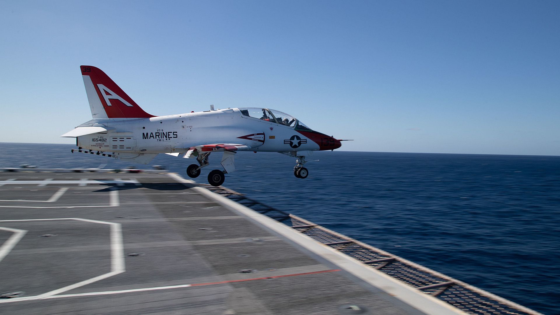 A T45C Goshawk, attached to Training Air wing 1, approaches USS Gerald R. Ford’s Flight Deck, Feb. 3, 2021. Ford is underway in the Atlantic Ocean conducting carrier qualifications. (U.S. Navy photo by Mass Communication Specialist Seaman Anton Wendler)