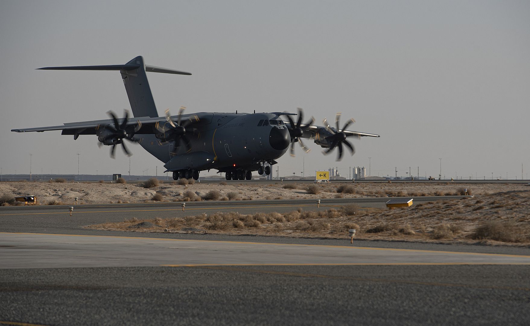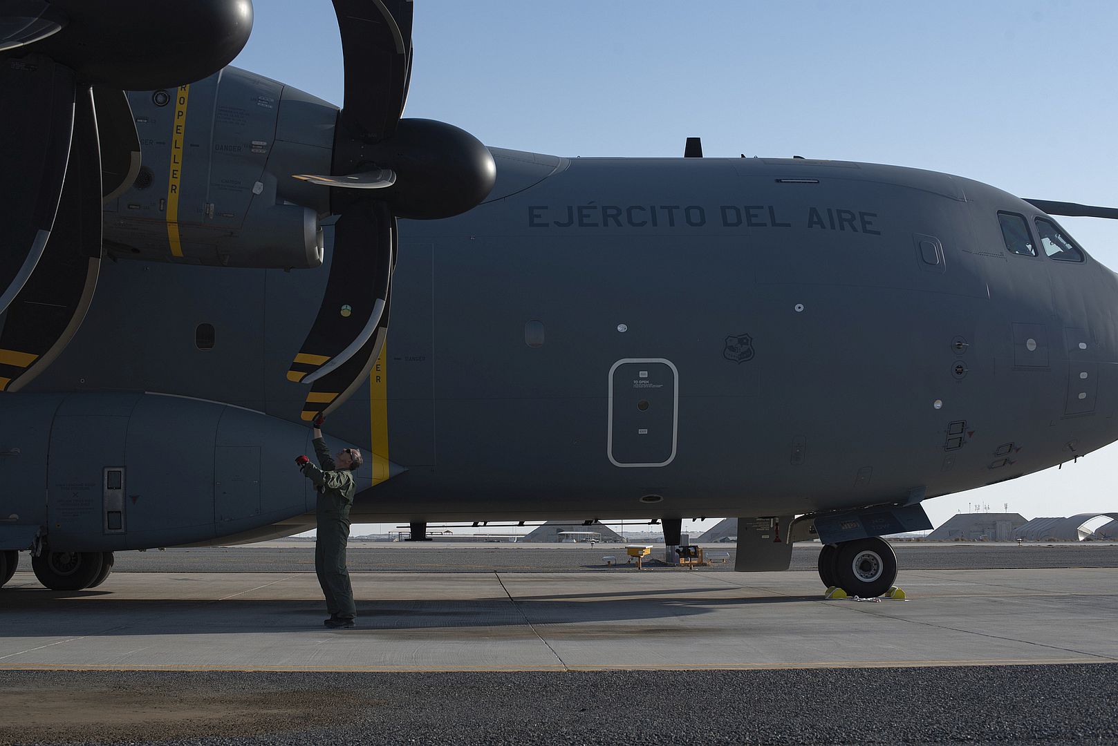 An Airbus A400M Atlas assigned to the Ala 31 (31st Wing), Ejército Del Aire (Spanish Air Force) arrives at Ali Al Salem Air Base, Kuwait, Nov. 29, 2021. The 31st Wing transited through ASAB to transport traveling service members after a deployment to Iraq, and to pick up incoming rotating members. ASAB serves as the theater gateway for U.S. Central Command and coalition forces in Southwest Asia. (U.S. Air Force photos by Senior Airman Michael S. Murphy)