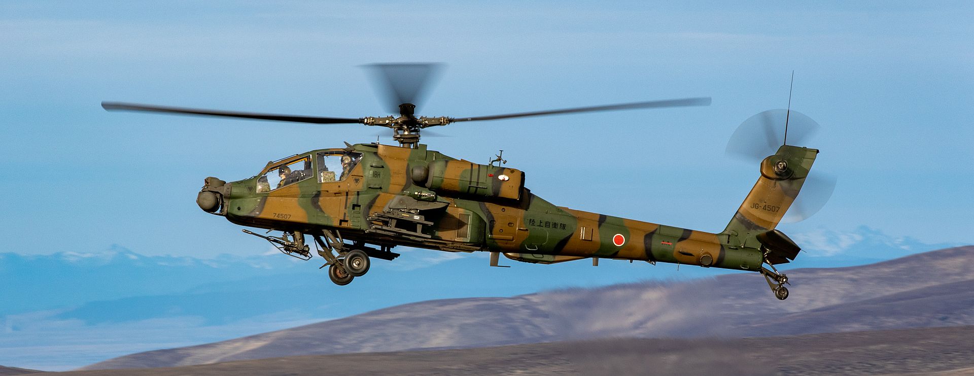 Main AdminAviators assigned to 1st Battle Helicopter Unit, Japanese Ground Self Defense Force, pilot an AH-64 Apache helicopter at Yakima Training Center, Wash., on Dec. 3, 2021. The unit is conducting a combined arms training exercise with units from the 7th Infantry Division as part of Exercise Rising Thunder 21. (U.S. Army photos by Capt. Kyle Abraham, 16th Combat Aviation Brigade)