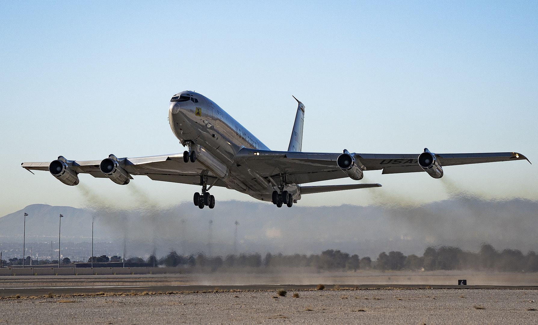 An E-8C, Joint Surveillance Target Attack Radar System, or Joint STARS, takes-off for a Weapons School Integration mission at Nellis Air Force Base, Nevada, Nov. 22, 2021. The primary mission is to provide theater ground and air commanders with ground surveillance to support attack operations and targeting that contributes to the delay, disruption and destruction of enemy forces. (U.S. Air Force photo by William Lewis)