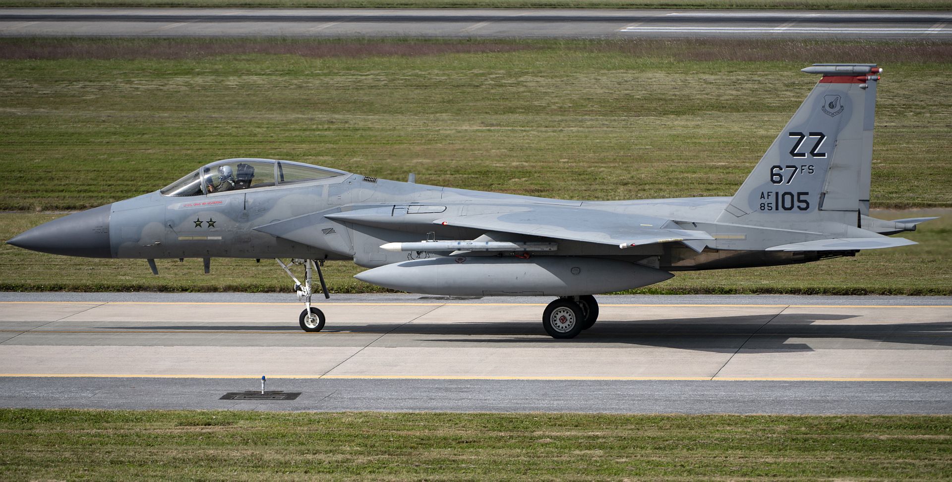 An F-15C Eagle assigned to the 67th Fighter Squadron taxis to the runway at Kadena Air Base, Japan, Nov. 17, 2021. Kadena’s fighter squadrons conduct routine training in order to enhance combat readiness and increase the tactical proficiency needed to maintain a free and open Indo-Pacific region. (U.S. Air Force photo by Senior Airman Jessi Monte)
