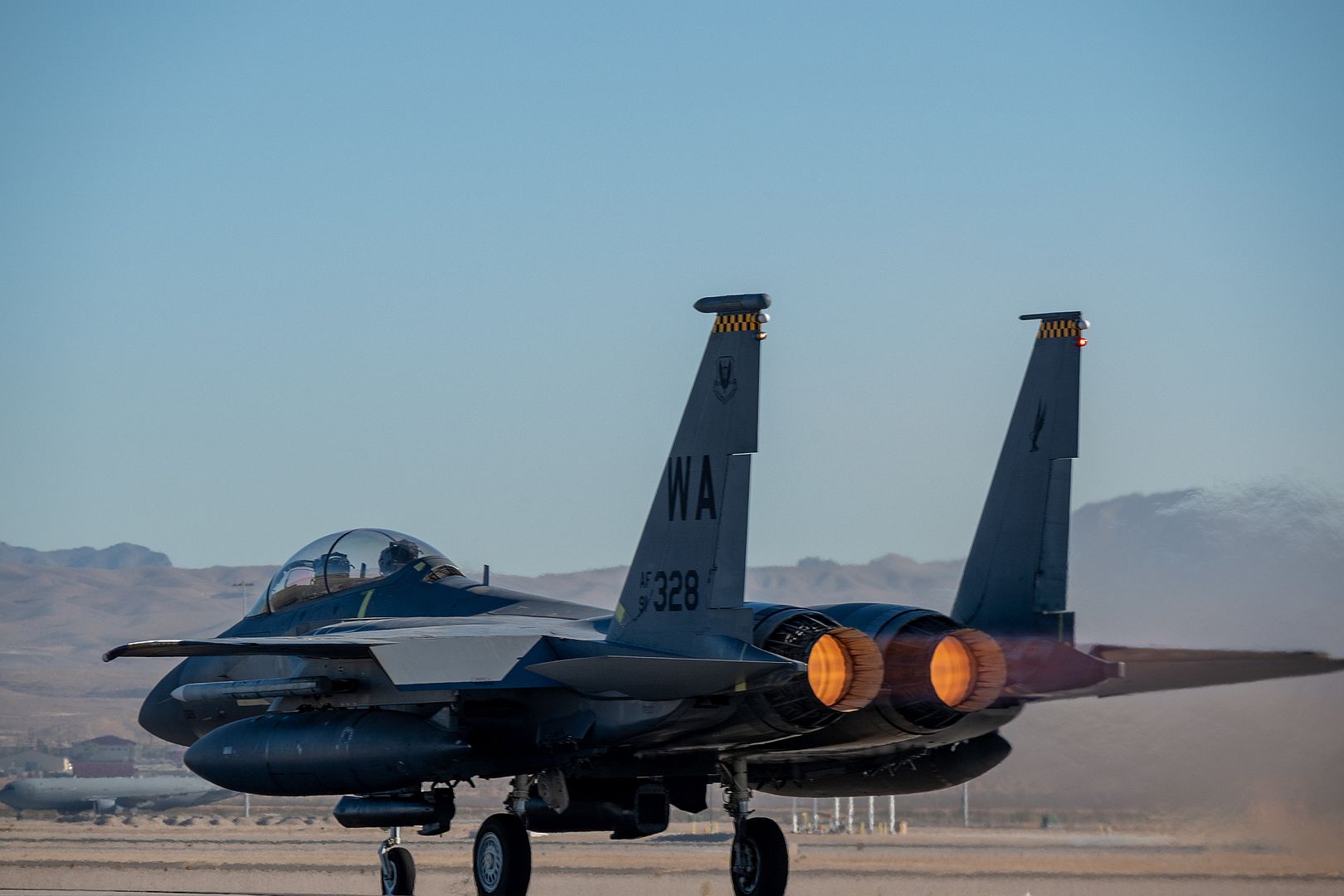 An F-15E Strike Eagle assigned to the 422nd Test and Evaluation Squadron takes off during Weapons School Integration at Nellis Air Force Base, Nevada, Nov. 30, 2021. The U.S. Air Force Weapons School teaches graduate-level instructor courses that provide advanced training in weapons and tactics employment to officers and enlisted specialists of the combat and mobility air forces. (U.S. Air Force photo by Michael J. Hasenauer) (U.S. Air Force photo by Michael J. Hasenauer)