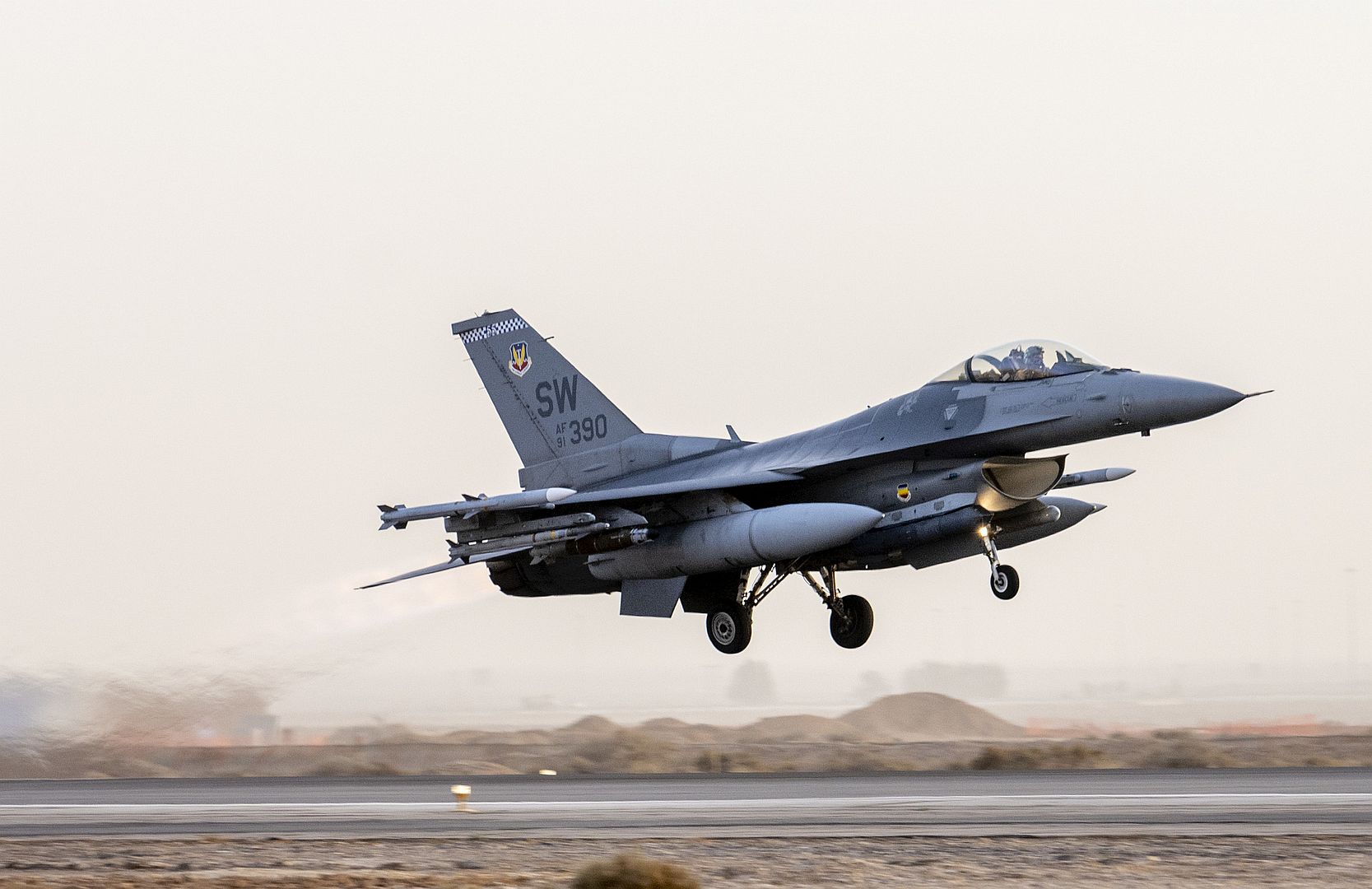 An F-16 Falcon fighter aircraft assigned to the 16th Weapons Squadron, U.S. Air Force Weapons School, takes-off for a Weapons School Integration (WSINT) mission at Nellis Air Force Base, Nevada, November 18, 2021. WSINT provides personnel further exposure into a joint environment to ensure readiness and increase lethality. (U.S. Air Force photo by William Lewis)