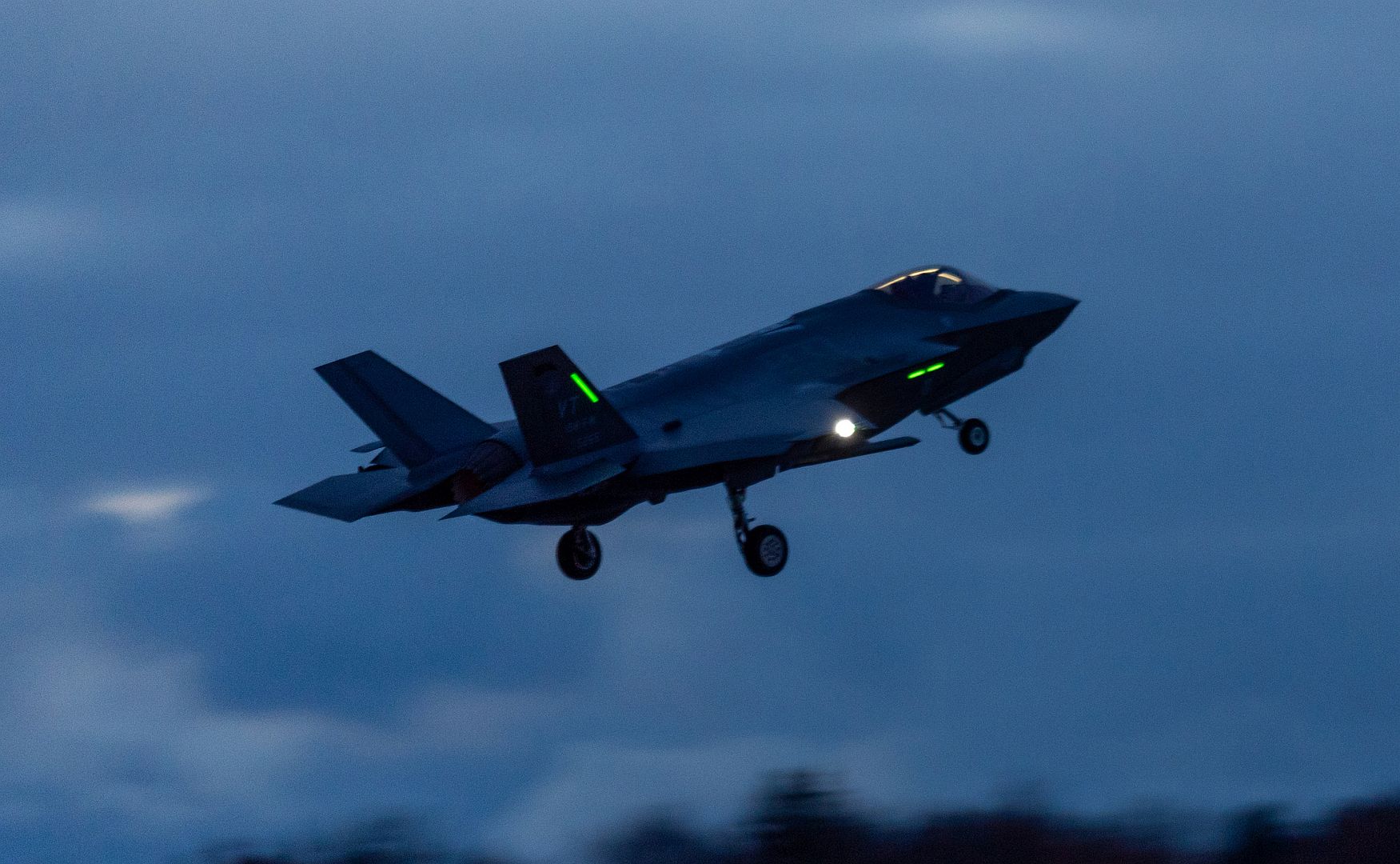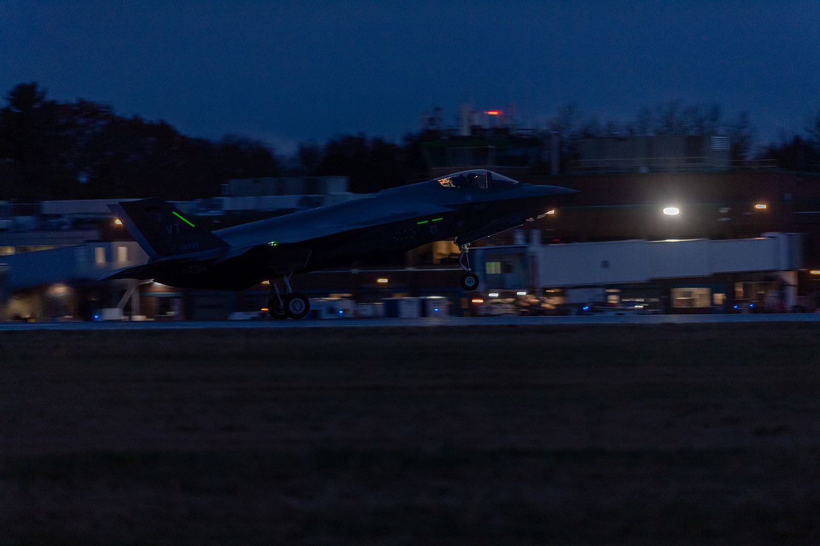 An F-35A Lightning II departs from the Vermont Air National Guard base during a routine night training mission, South Burlington, Vt., Nov. 16, 2021. Pilots assigned to the 134th Fighter Squadron and Airmen assigned to the 158th Fighter Wing are required to conduct night operations to meet U.S. Air Force and Major Command requirements and proficiencies. (U.S. Air National Guard photos by Mrs. Julie M. Paroline)