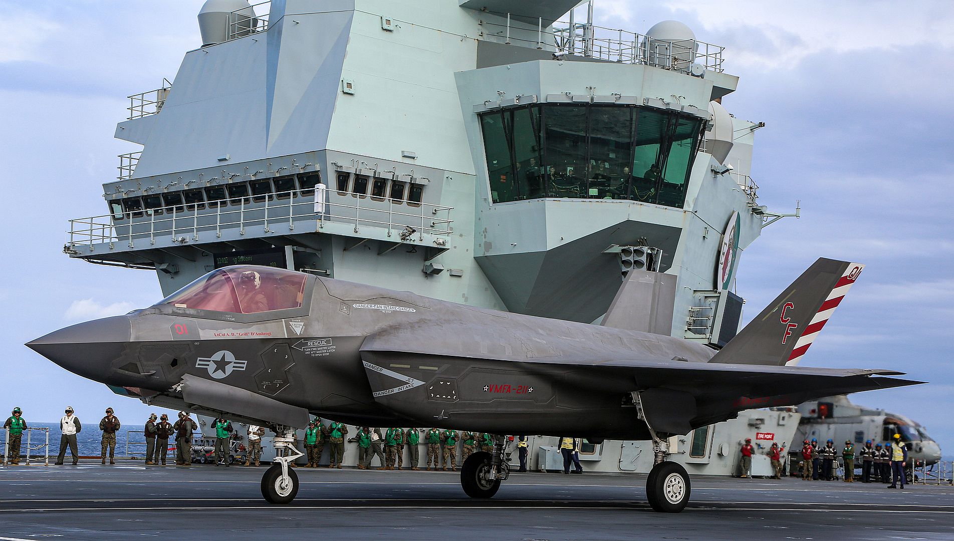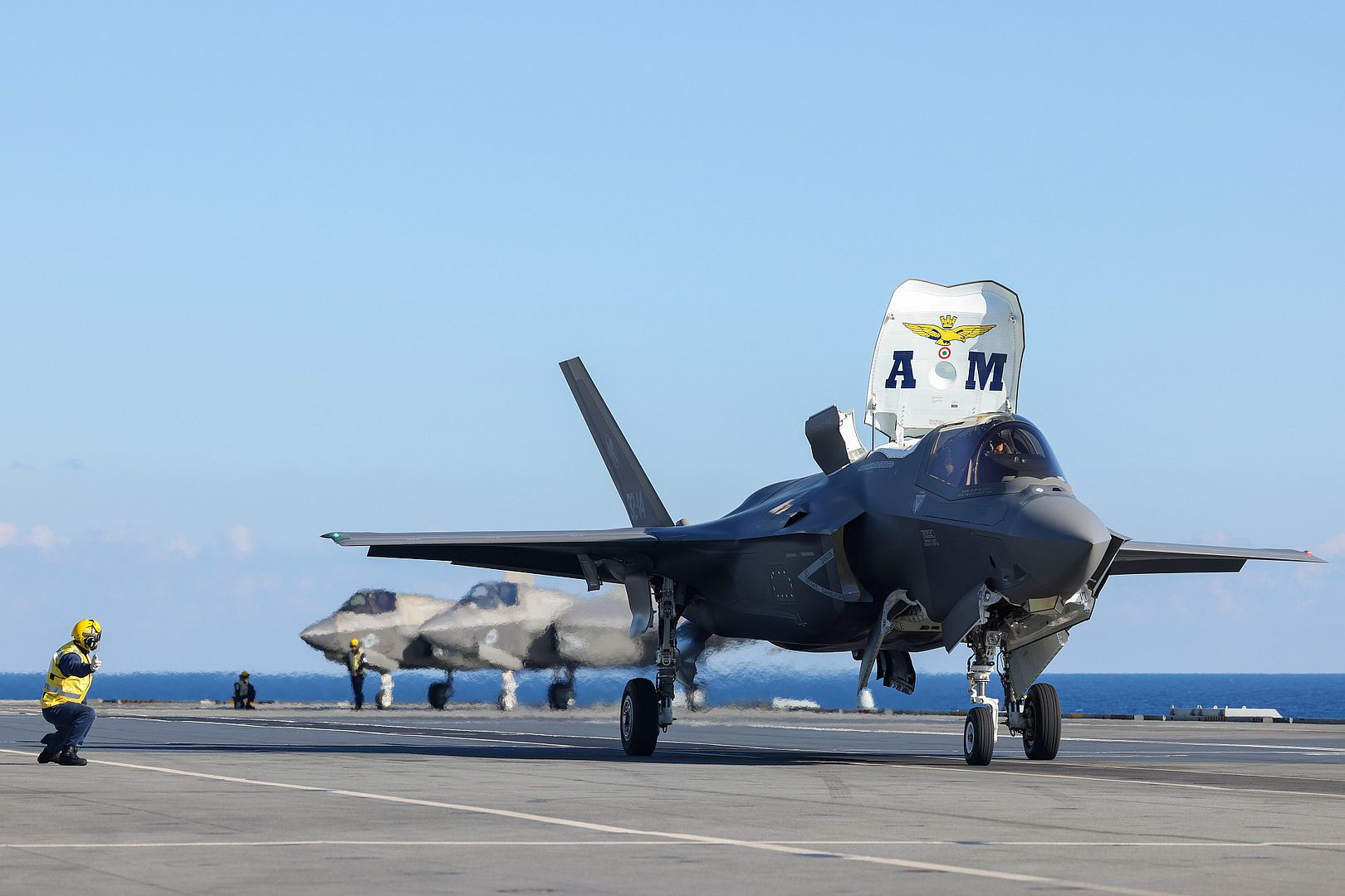 An Italian Navy F-35B Lighting II lands on the flight deck of HMS Queen Elizabeth in the Mediterranean Sea on November 21, 2021. Marine Fighter Attack Squadron (VMFA) 211, the United Kingdom's 617 Squadron, the Italian Air Force and Italian Navy conducted cross-deck operations between Queen Elizabeth and ITS Cavour, improving the carrier’s interoperability. This was the fourth-cross deck operation VMFA-211 has conducted during Carrier Strike Group 21 and the first utilizing a foreign ship as an intermediate refueling point. (Royal Navy photography by LPhot Unaisi Luke)
