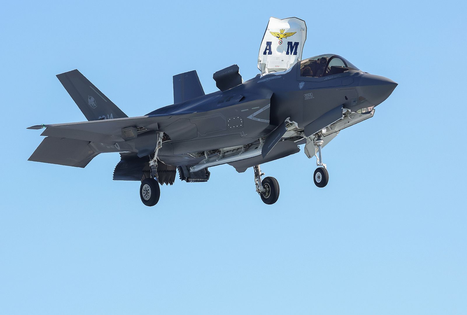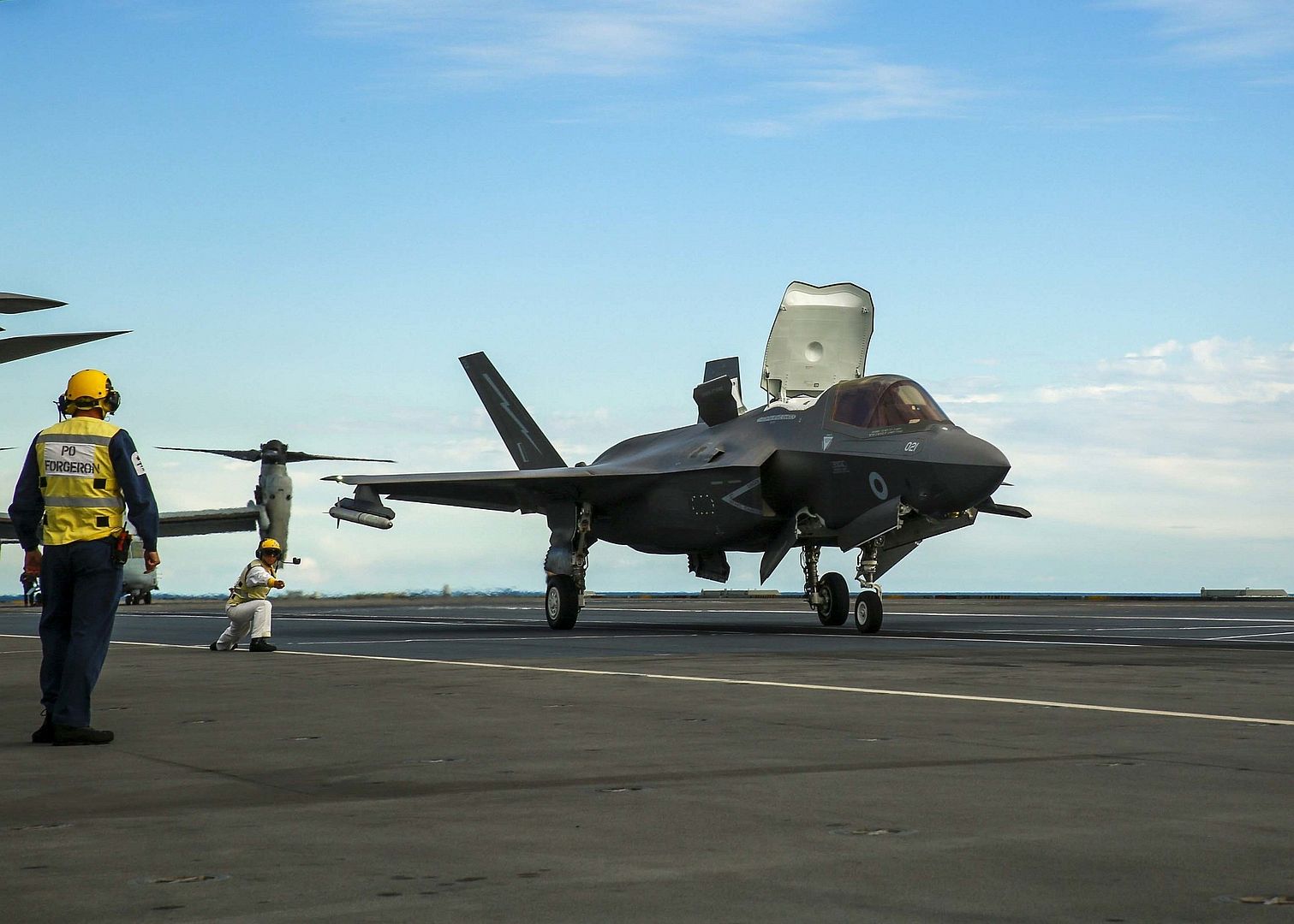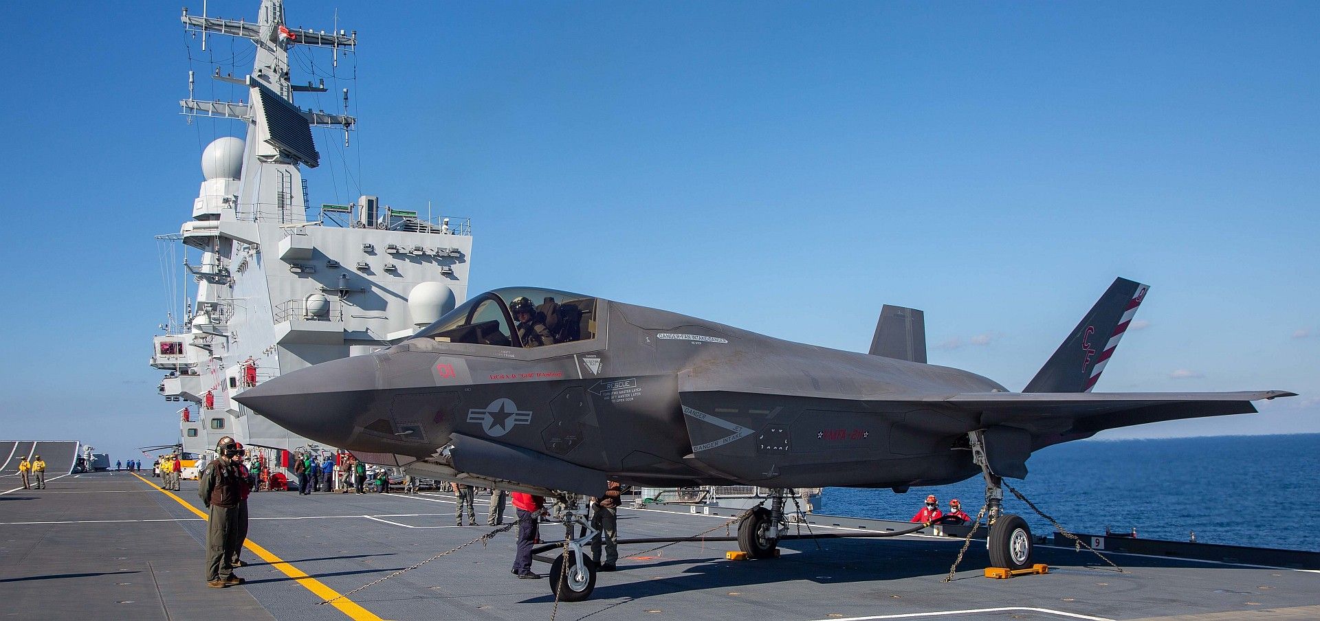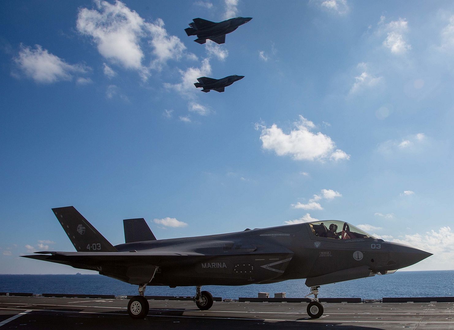 U.S. Marines LtCol Andrew D’Ambrogi and Capt Jacob Slaughter with Marine Fighter Attack Squadron (VMFA) 211 fly an F-35B Lightning II past the flight deck of the Italian Navy ITS Cavour in the Mediterranean Sea on November 21, 2021. VMFA-211, the United Kingdom's 617 Squadron, the Italian Air Force and Italian Navy conducted cross-deck operations between HMS Queen Elizabeth and Cavour, improving the carriers interoperability. This was the fourth-cross deck operation VMFA-211 has conducted during Carrier Strike Group 21 and the first utilizing a foreign ship as an intermediate refueling point.