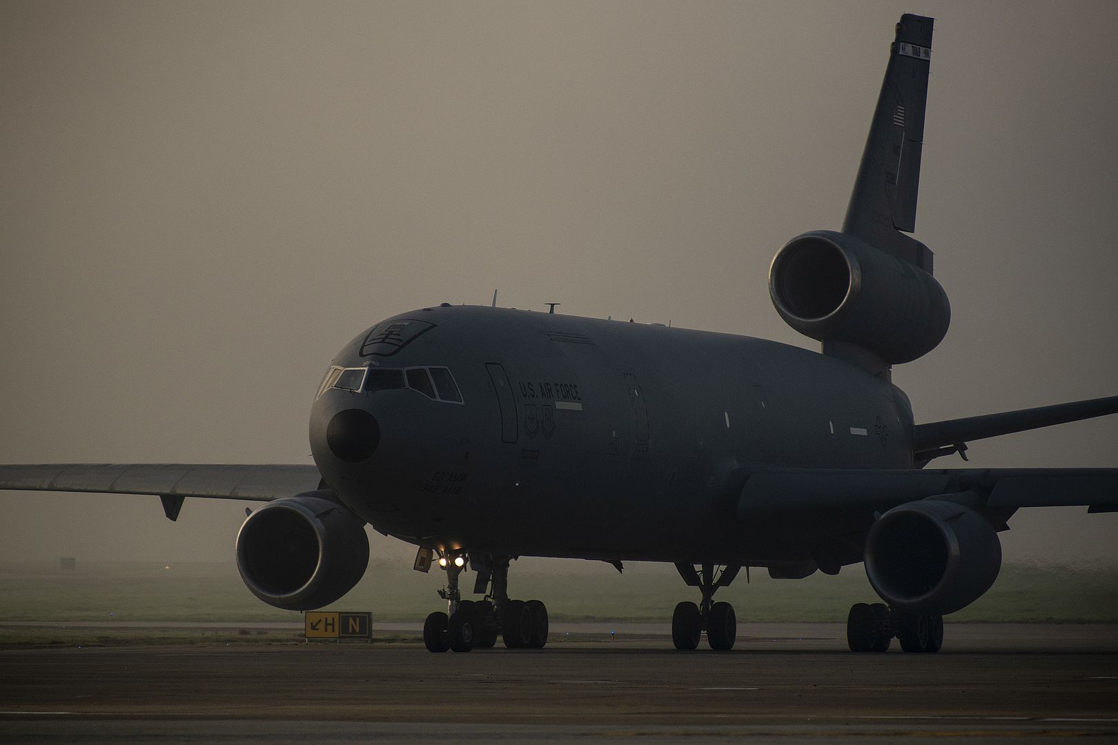 A U.S. Air Force KC-10 Extender taxis on the flight line at Travis Air Force Base, California, Dec. 1, 2021. While the KC-l0's primary mission is aerial refueling, it can combine the tasks of a tanker and cargo aircraft by simultaneously refueling aircraft and transporting support personnel and equipment. (U.S. Air Force photo by Nicholas Pilch)