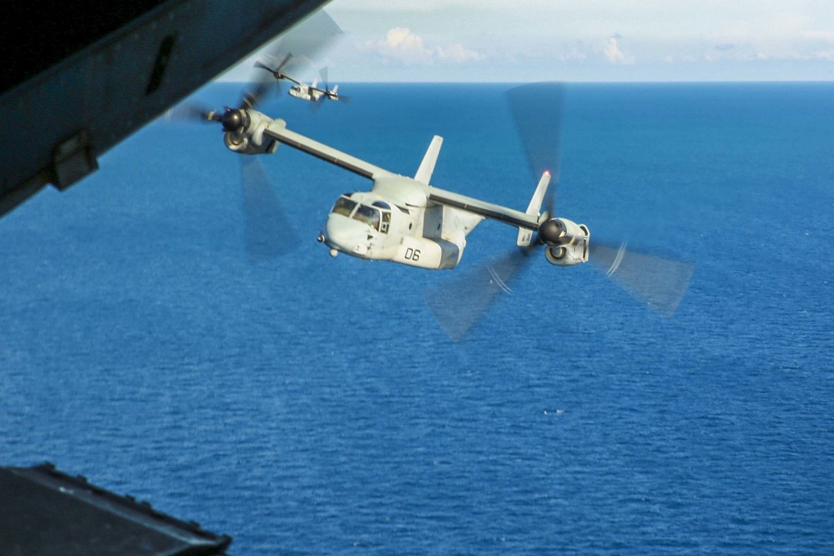 Two MV-22 Ospreys with Marine Medium Tiltrotor Squadron (VMM) 365 fly off the coast of Italy carrying NATO Ambassadors to Her Majesty's Ship Queen Elizabeth, Nov. 22, 2021. Visitors flew on U.S. Marine Corps MV-22 Ospreys to the ship where they observed U.K. and U.S. F-35 Lightning jets take off and land and toured the ship. (U.S. Marine Corps photos by Staff Sgt. Bryani Musick)