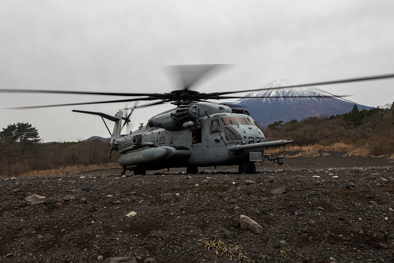 U.S. Marines with Marine Heavy Helicopter Squadron (HMH) 466 conduct flight operations during Stand-in Force Exercise 24 at Combined Arms Training Center Camp Fuji, Japan, Dec. 5, 2023. SIFEX 24 is a division-level exercise involving all elements of the Marine Air-Ground Task Force focused on strengthening multi-domain awareness, maneuver, and fires across a distributed maritime environment. (U.S. Marine Corps photo by Cpl. Kyle Chan)