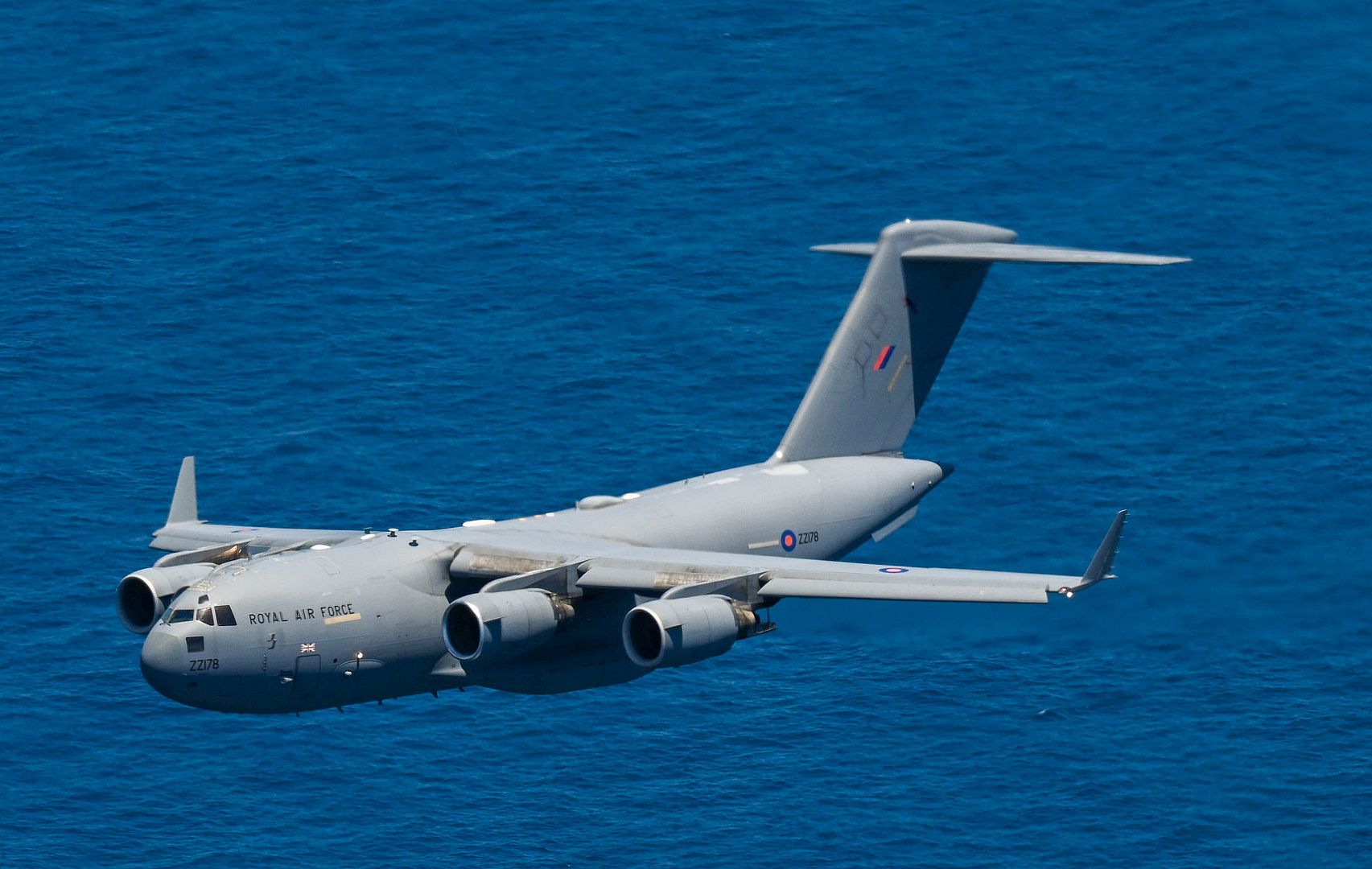 A Royal Air Force C-17 Globemaster III participates in a training flight alongside the U.S and Royal Australian Air Force during Exercise Global Dexterity 23-2 in the skies of Australia, Dec. 8, 2023. Exercise Global Dexterity prepares our air forces for combined action in wartime, peacetime and humanitarian operations throughout the Indo-Pacific. (U.S. Air Force photo by Senior Airman Makensie Cooper)