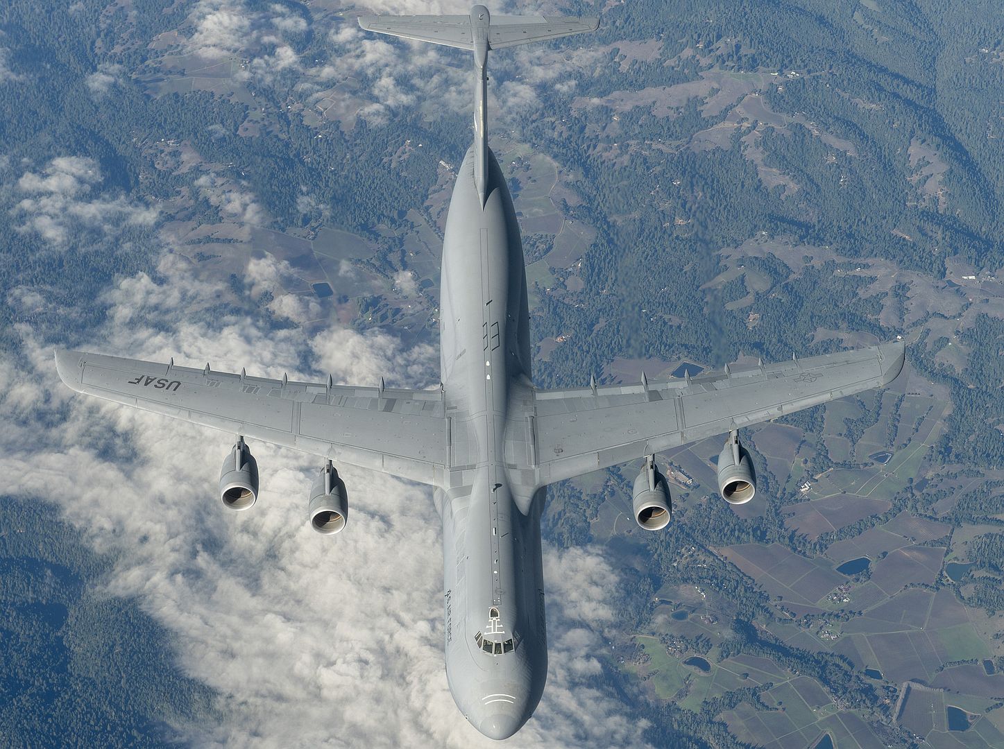 A C-5M Super Galaxy flies in an aerial refueling track over Northern California and Oregon, Dec. 12, 2023. A KC-10 supported the C-5M’s proof of concept testing in its ability to provide a tanker aircraft fuel in an emergency. (U.S. Air Force photo by Master Sgt. Traci Keller)