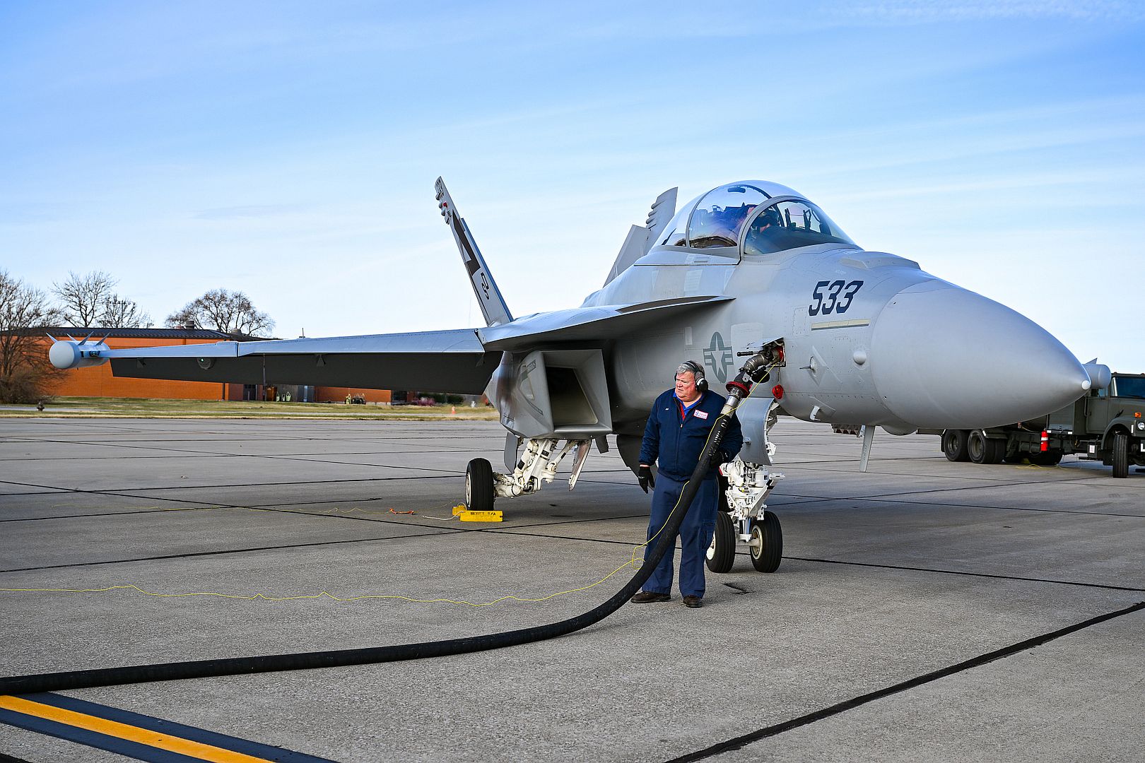 Jim Billingsley, 375th Operations Support Squadron transient alert aircraft servicer, conducts hot-pit refueling on a U.S. Navy EA-18G Growler, Dec. 13, 2023, on Scott Air Force Base, Illinois. Timely refueling on the ground reduces the need for extensive downtime, contributing to increased sortie rates and mission effectiveness. (U.S. Air Force photo by Airman 1st Class De’Quan Simmons)