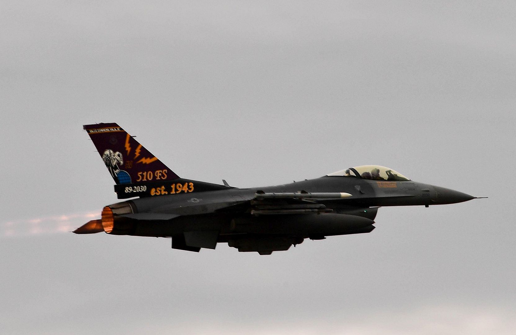 A U.S. Air Force F-16 Fighting Falcon assigned to the 510th Fighter Squadron takes off in support of Exercise Fighting Wyvern 23-02 at Aviano Air Base, Italy, Dec. 11, 2023. Exercise Fighting Wyvern showcased the ability to successfully execute Agile Combat Operations within theaters of operations worldwide. (U.S. Air Force photo by Senior Airman Noah Sudolcan)