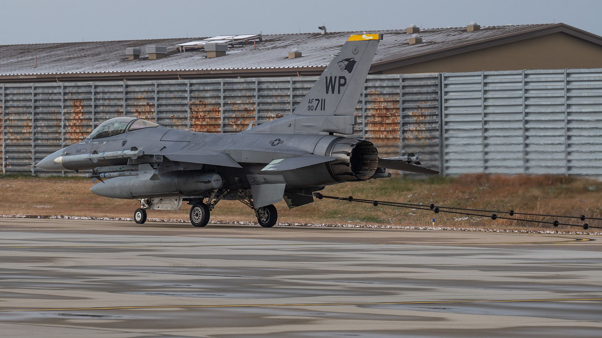 A U.S. Air Force F-16 Fighting Falcon assigned to the 80th Fighter Squadron hooks an arresting cable during a certification test at Kunsan Air Base, Republic of Korea, Dec. 1, 2023. Along with certifying the arresting cable, F-16s from Kunsan AB tested the alternate departure and landing surface as an active air strip to launch or recover the F-16 mission. (U.S. Air Force photo by Tech. Sgt. Emili Koonce)