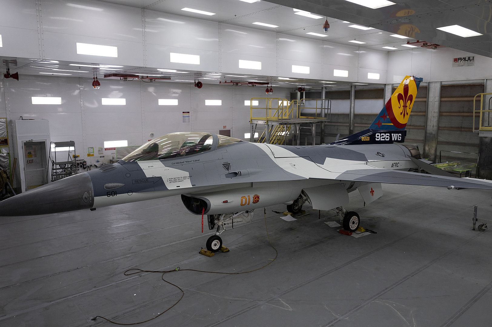 The newly painted flag ship F-16 Fighting Falcon of the 706th Aggressor Squadron of the 926th Wing, U.S. Air Force Reserves, Nellis Air Force Base, is ready to be taken out of the 57th corrosion control facility, 1 Dec. 2023. The freshly painted aggressor will provide pilots the opportunity to train against a U.S. aggressor force that replicated advanced and credible adversary tactics. (U.S. Air Force photo by William R. Lewis)