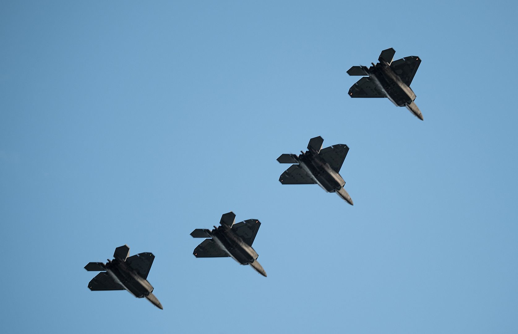 F-22 Raptors assigned to the Hawaii Air National Guard perform a flyover during a December 7th Remembrance Ceremony at Joint Base Pearl Harbor-Hickam, Hawaii, Dec. 7, 2023. This was the 82nd anniversary of the attacks on Pearl Harbor and Hickam Field that claimed the lives of 189 service members. (U.S. Air Force photo by Staff Sgt. Alan Ricker)