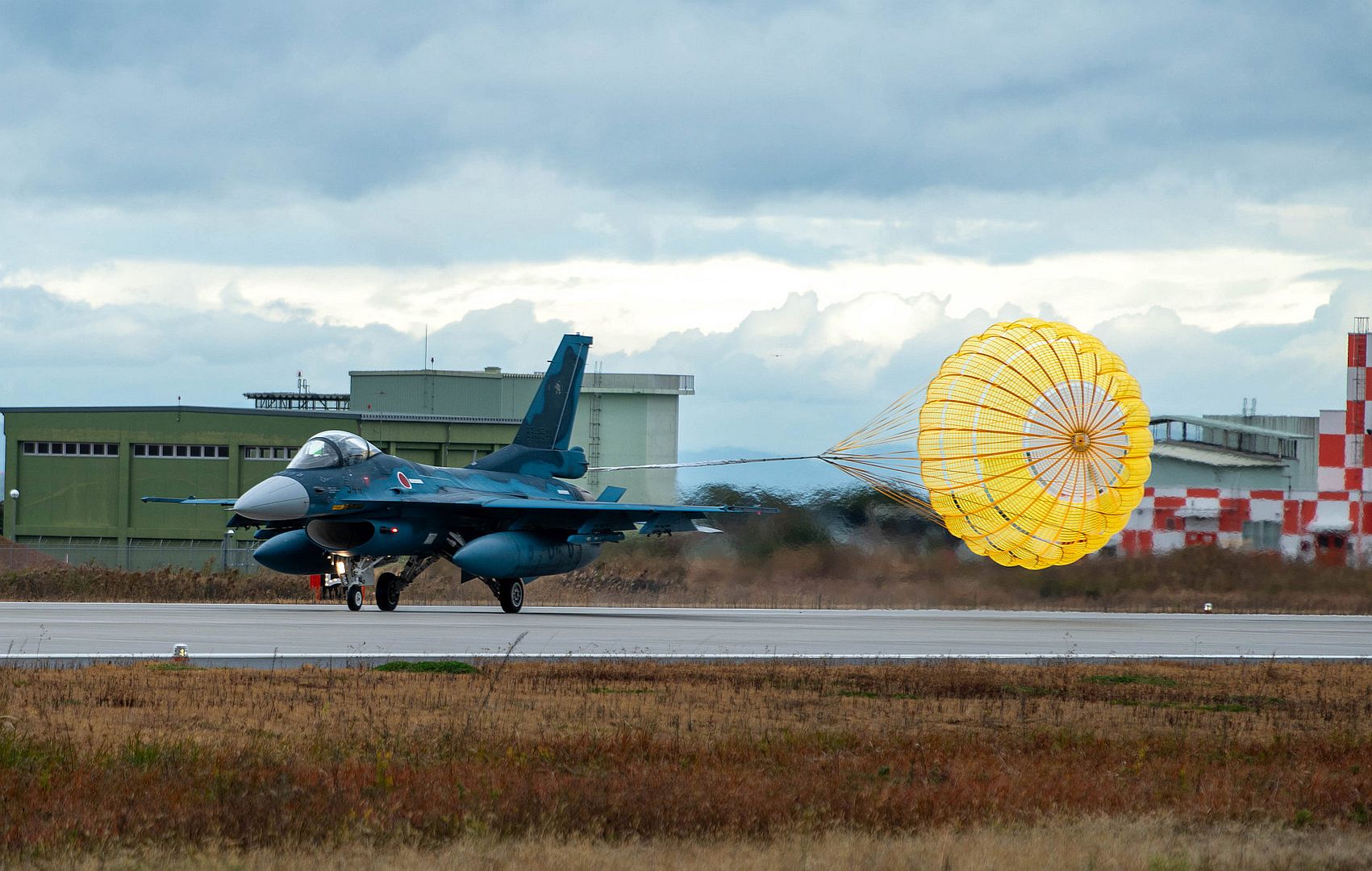 A Japan Air Self-Defense Force F-2 deploys its drag parachute as it lands in support of the Aviation Training Relocation program at Tsuiki Air Base, Japan, Dec. 5, 2023. For more than 60 years, the U.S.-Japan security alliance has served as the cornerstone of peace and security in the Indo-Pacific region. (U.S. Air Force photo by Airman 1st Class Luis E. Rios Calderon)