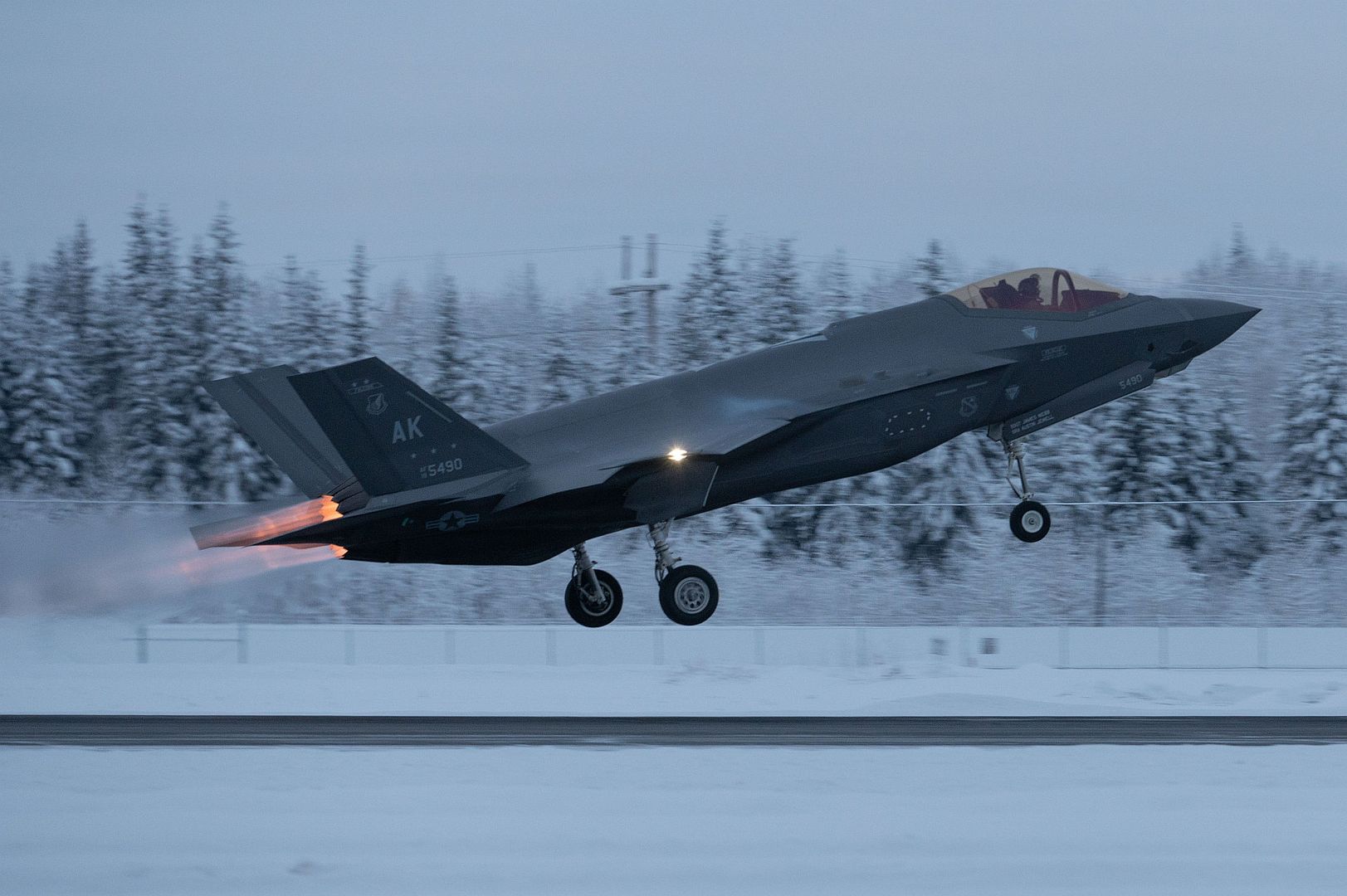 An F-35A Lightning II takes off for routine training on Eielson Air Force Base, Alaska, Dec. 18, 2023. The 354th Fighter Wing provides U.S. Indo-Pacific Command with continuous unrivaled air, space, and cyberspace capabilities to ensure regional stability and security. (U.S. Air Force photo by Airman 1st Class Carson Jeney)