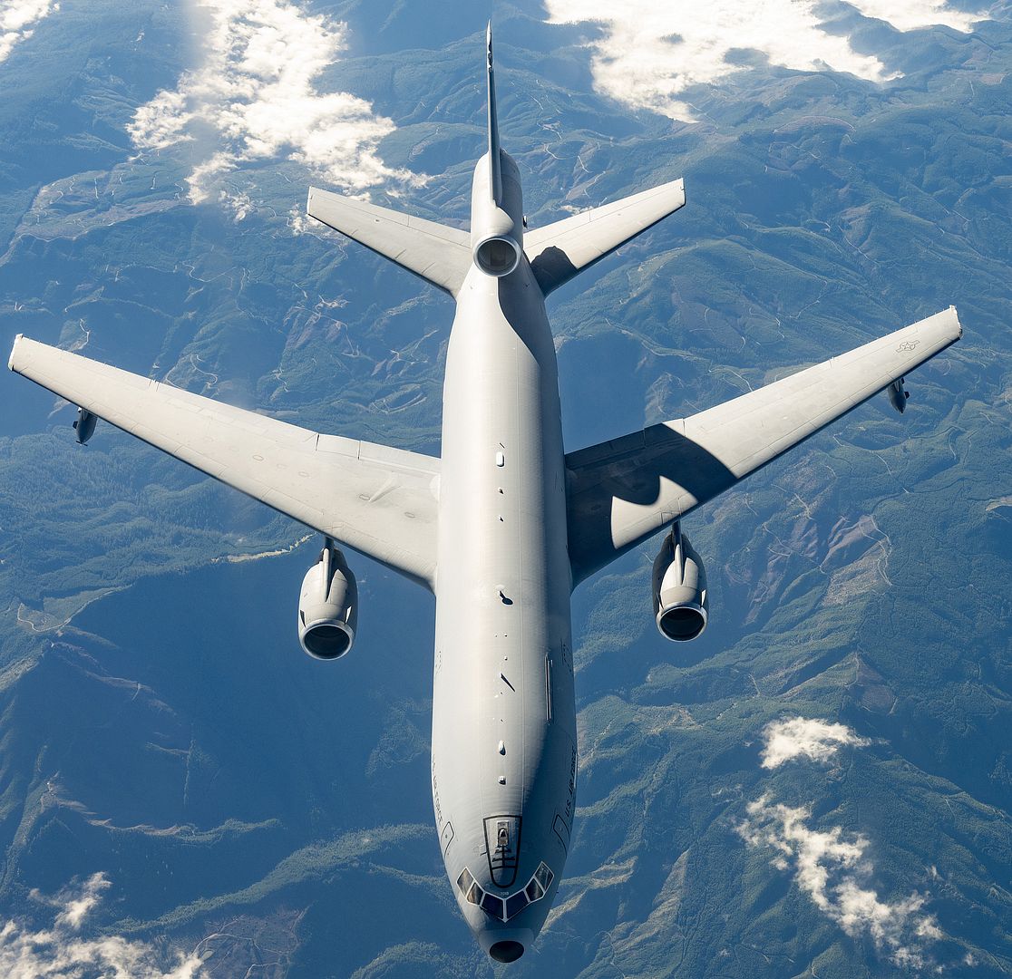 A KC-10 Extender flies in an aerial refueling track over Northern California and Oregon, Dec. 12, 2023. Travis Air Force Base is the last U.S. Air Force installation to operate KC-10 Extenders, as the Air Force plans to fully divest the fleet in 2024. (U.S. Air Force photo by Master Sgt. Traci Keller)