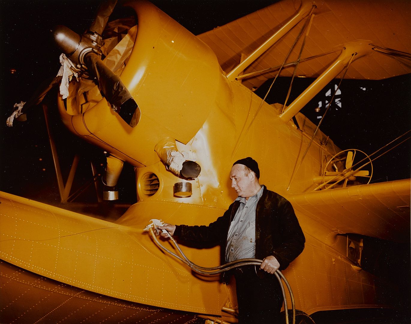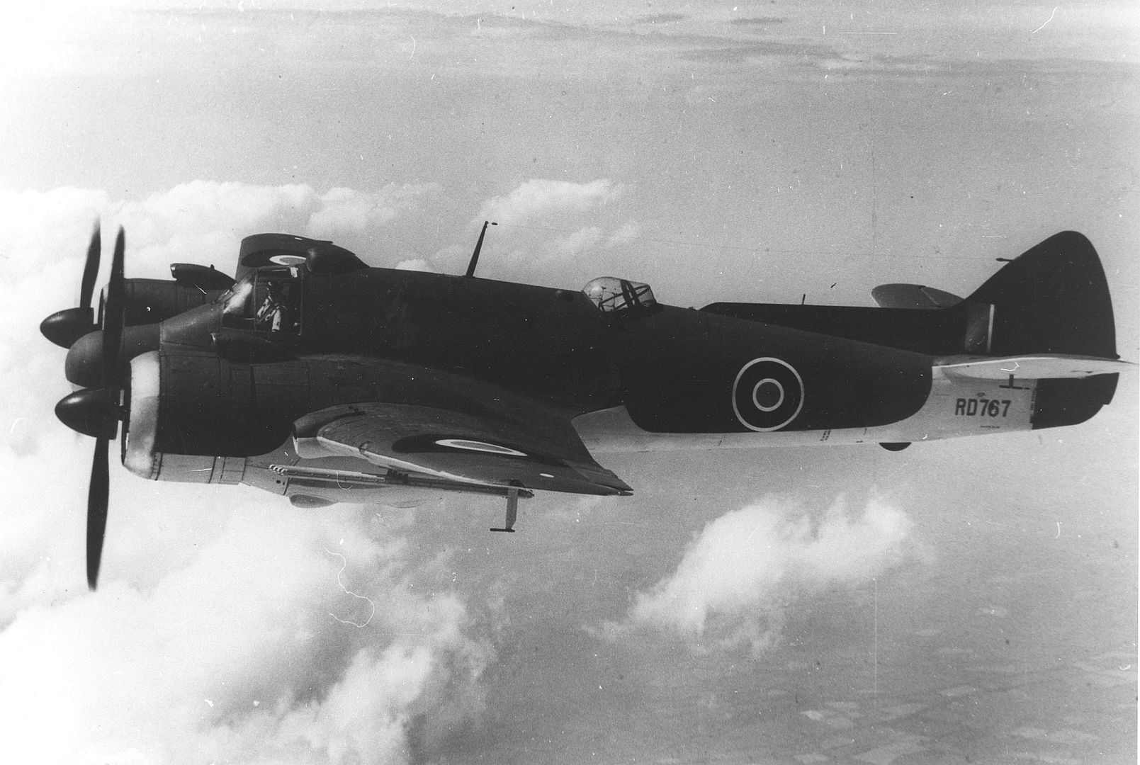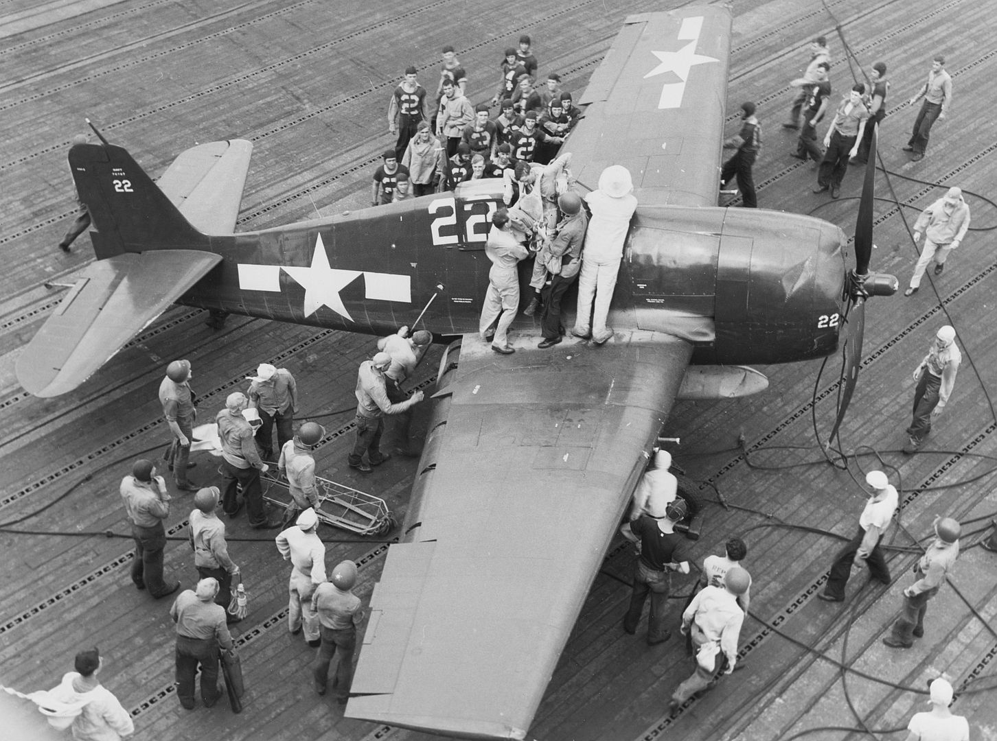 Air-to-air view of the first production Grumman TBF-1 torpedo bomber (BUNO 00373) dated 23 March 1942. The plane is in its carrier- landing attitude, with wheels , flaps, and tail hook down. The color scheme, standard from October 1941 until early 1943, consists of flat light gray undersurfaces with flat blue-gray sides and upper surfaces. "Circle-star-circle" National insignia are worn on fuselage sides and on upper and lower surfaces of both wingtips. Red and white rudder stripes were adopted at the end of December 1941 as an additional recognition marking. Both rudder stripes and the red insignia center circle were removed from navy aircraft shortly after coral sea (May 1942).