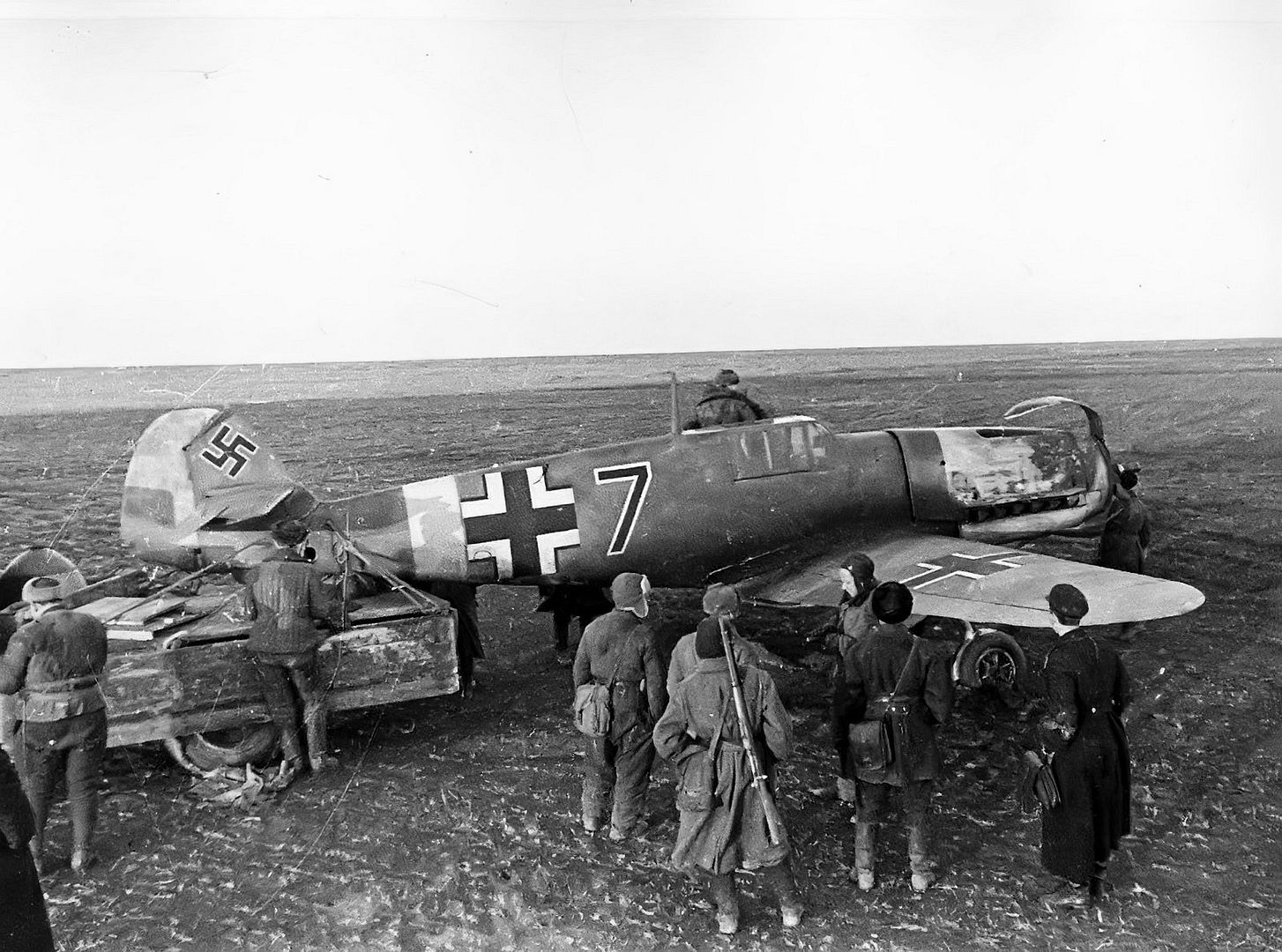 Soviet servicemen prepare to transport a downed German Messerschmitt Bf.109F-4 fighter (W.Nr. 13011 “Schwarze 7”) belonging to Lieutenant Heinz Frose of the 77th Fighter Wing “Red Ace” (Jagdgeschwader 77 “Herz As”).