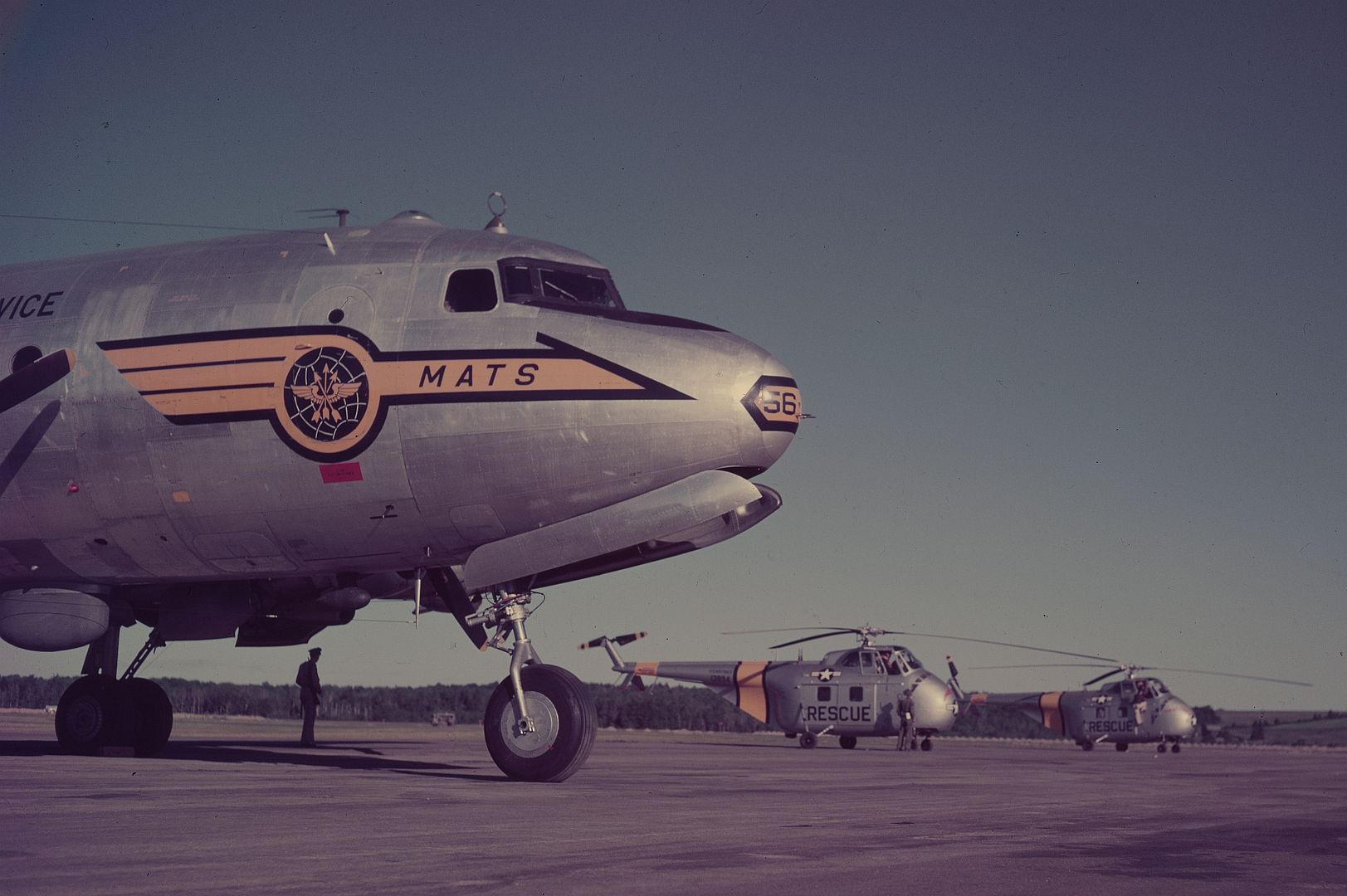 "USAF H-19 helicopter, 'Hop-A-Long' and 'Whirl-O-Way,' parked on the airfield at Goose Bay, Labrador, after completing the second leg of their trans-Atlantic flight from Westover, Mass., to Wiesbaden, Germany. In the foreground is the Military Air Transport Services' Douglas C-54 escort plane which carriers mechanics, photographers, and equipment needed for the long hop."